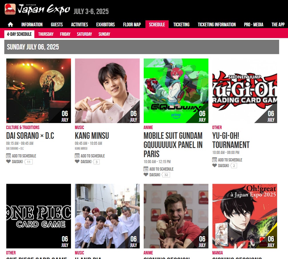 Japan Expo 公式サイトにてスケジュールが発表されました。