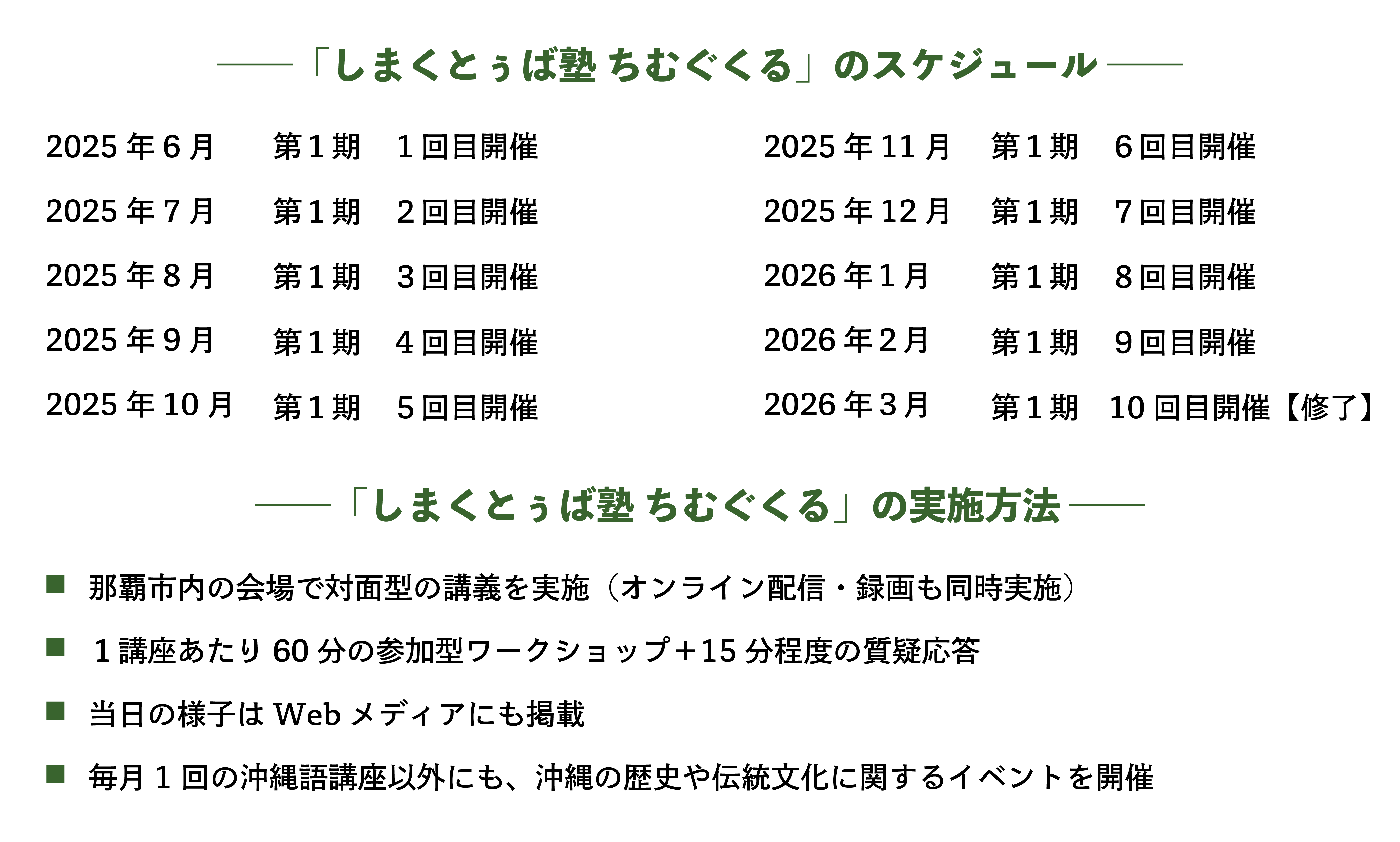 初年度は2025年6月(予定)から毎月1回、全10回の開催を予定しています。 毎回、沖縄語の講師を招聘して「楽しみながら深く学ぶ」をコンセプトに講座を展開します。