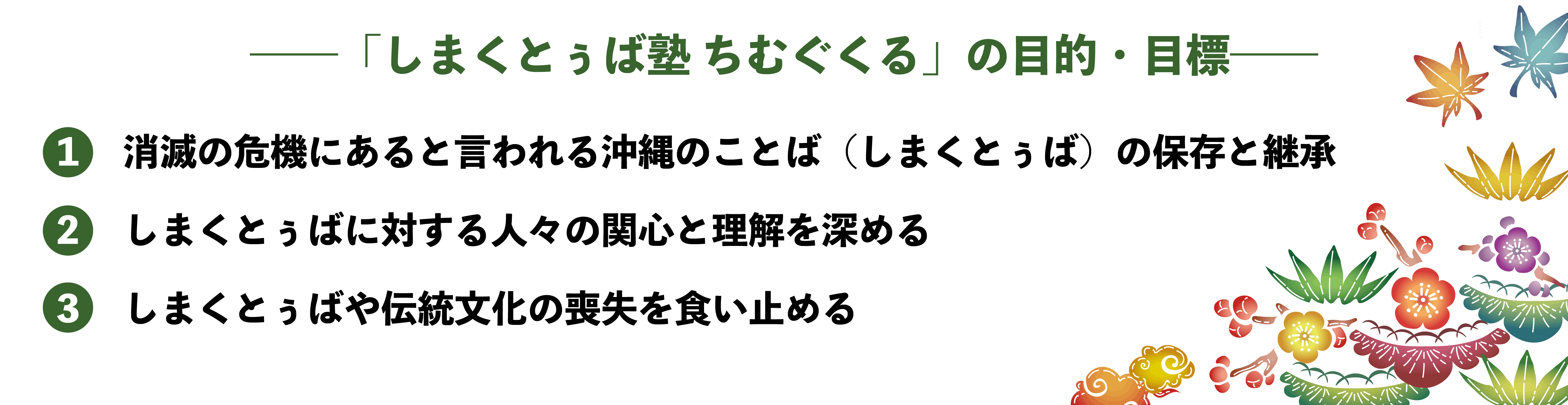 私たちが「しまくとぅば塾 ちむぐくる」を通して実現したいと考えている柱は次の3点です。