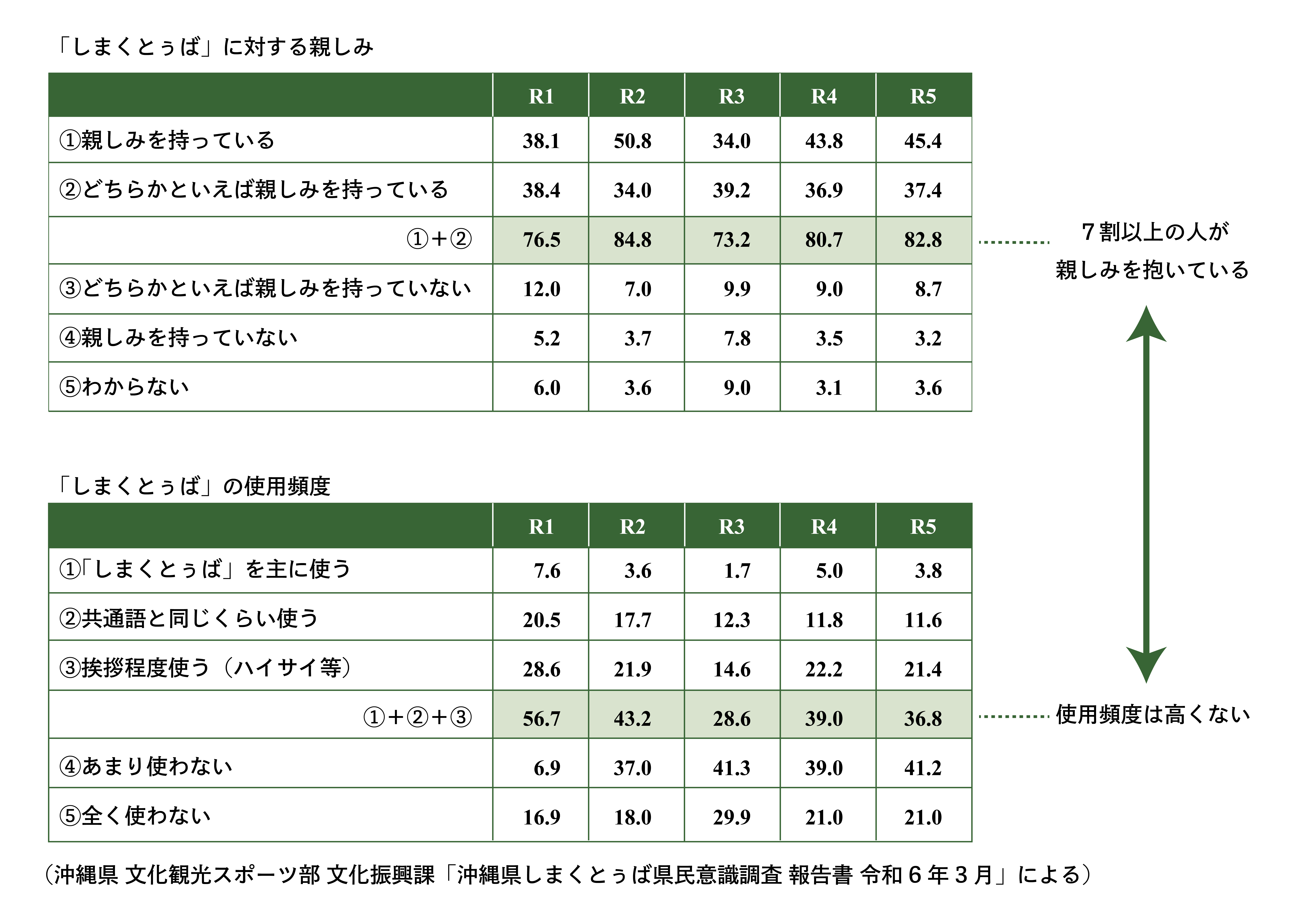 これらの「方言」を話す方々は高齢者であるケースが多く、次世代の担い手の創出が急務であると言われています。そして、私たちが「しまくとぅば塾 ちむぐくる」をスタートさせる沖縄では、「しまくとぅば(=沖縄のことば)」に対する親しみを抱いている人は調査対象者の8割を超えている(令和5年度調査)一方で、「しまくとぅば」を使う頻度は決して高くありません。
