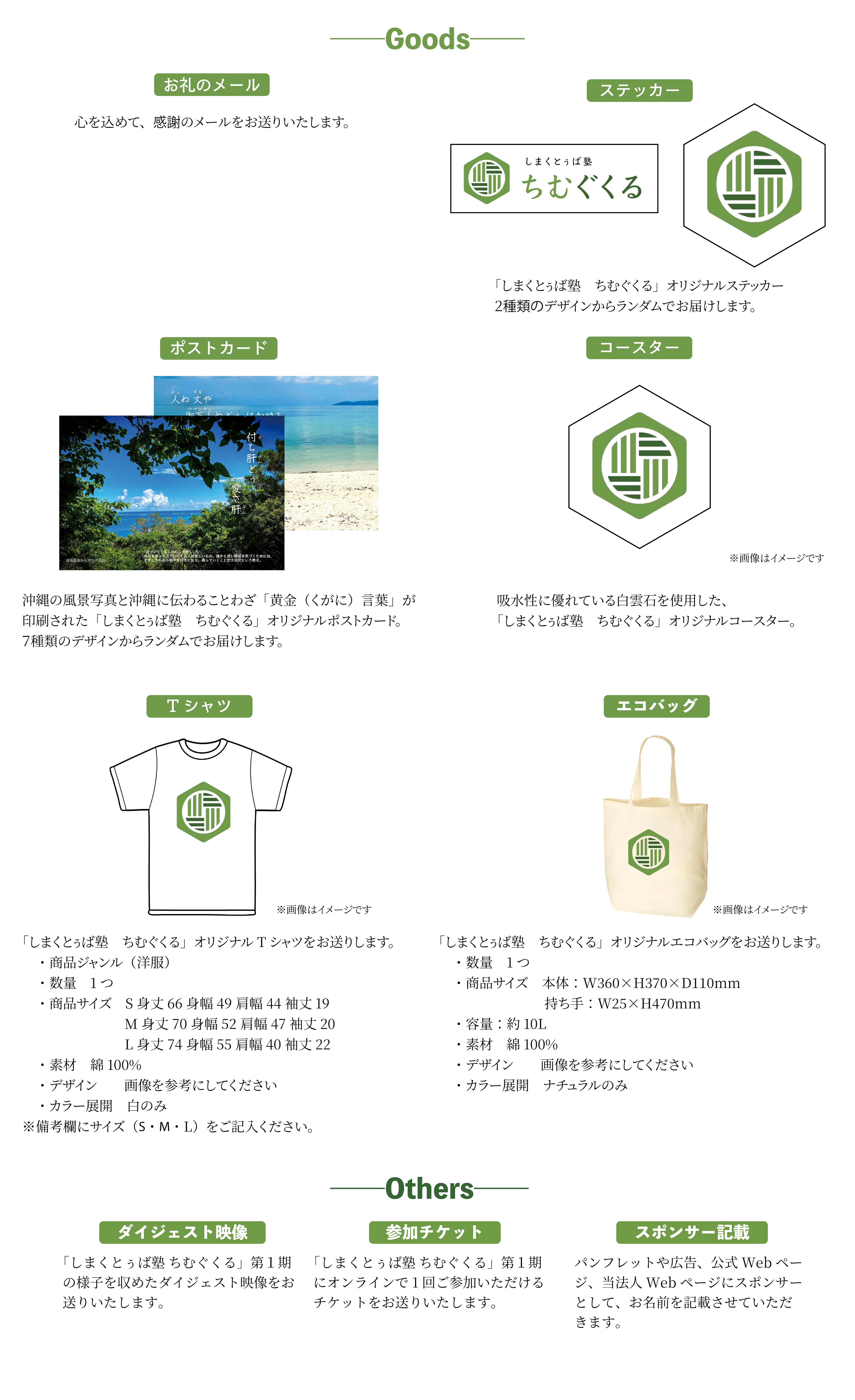 ご支援いただくリターンとして、「しまくとぅば塾 ちむぐくる」オリジナルグッズと、「しまくとぅば塾 ちむぐくる」を体験いただけるチケットやダイジェスト映像、スポンサー枠をご用意しております。