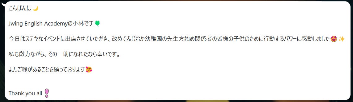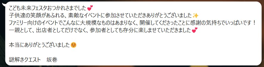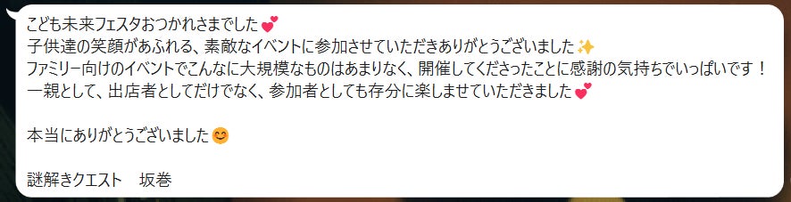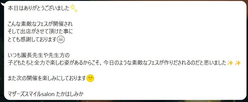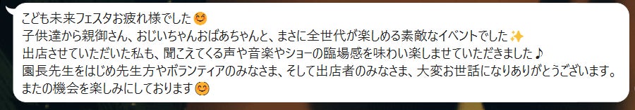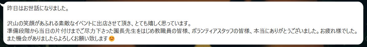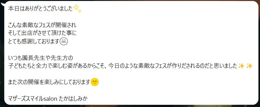 皆さまのおかげで、子育て支援の可能性を感じることができました。