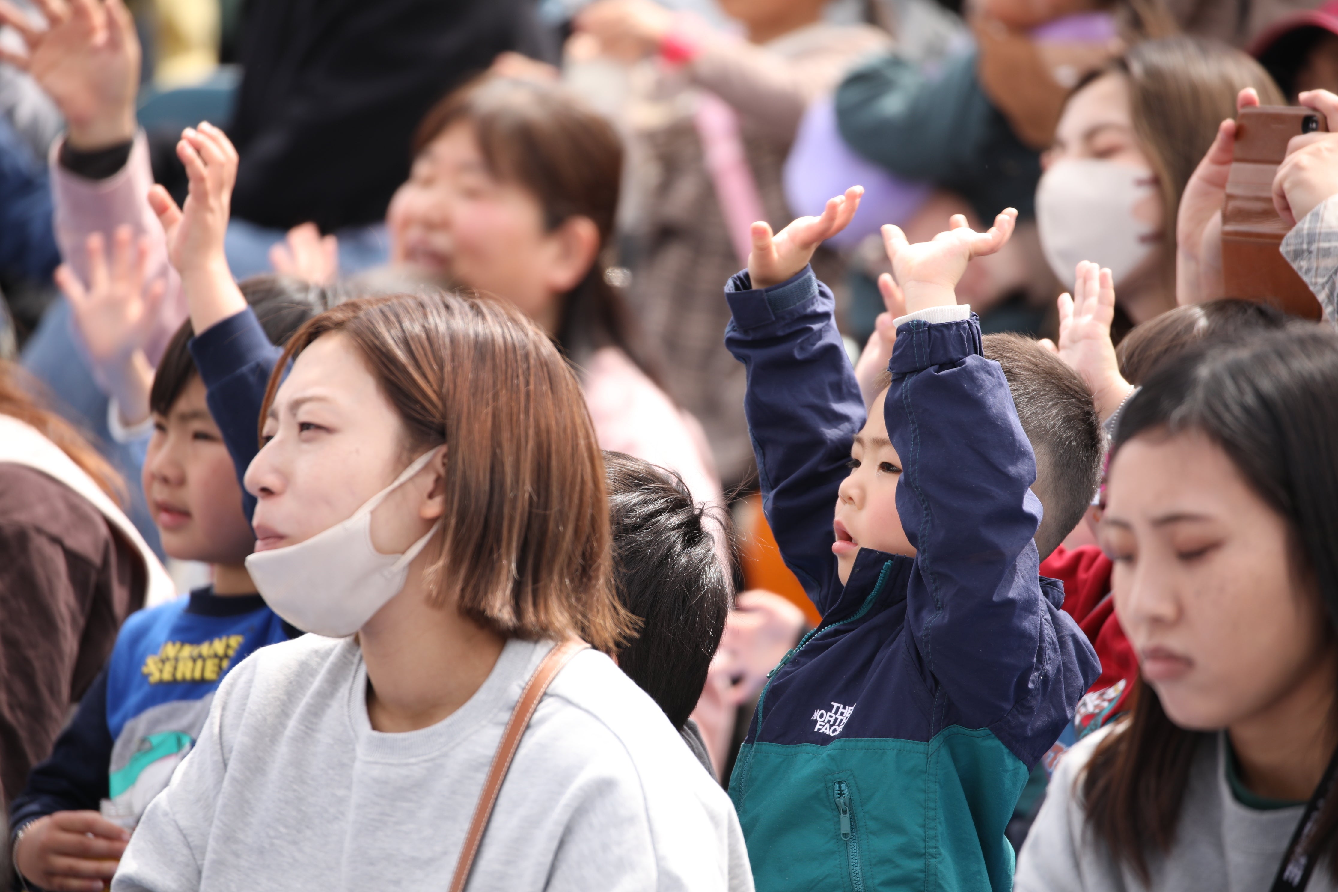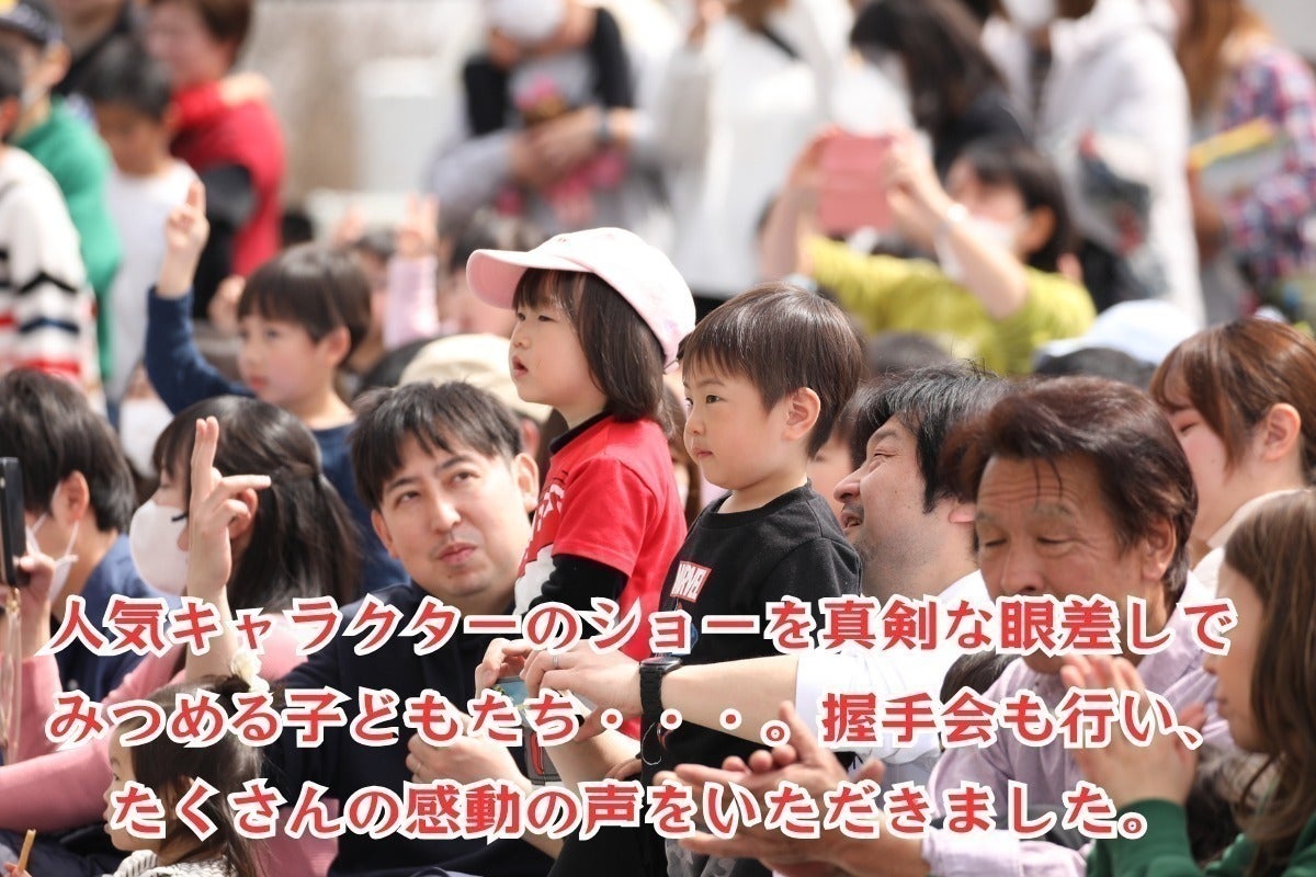 大人気のヒーローショーを真剣に眺めるこどもたち。最後にはヒーローとの握手会も行いました。