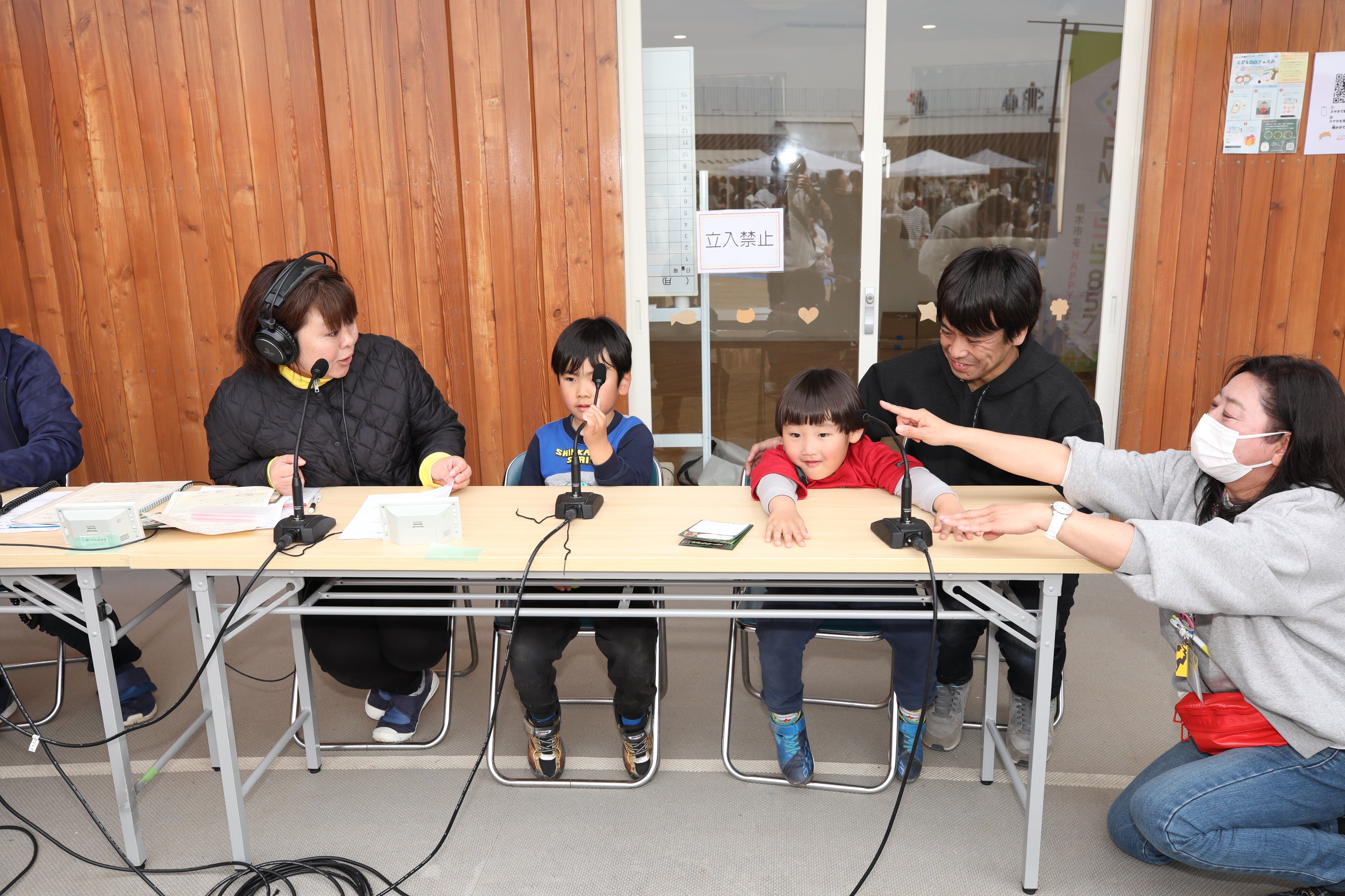 当日、ローカルラジオ番組と企画し、親子にインタビューするようすを生放送