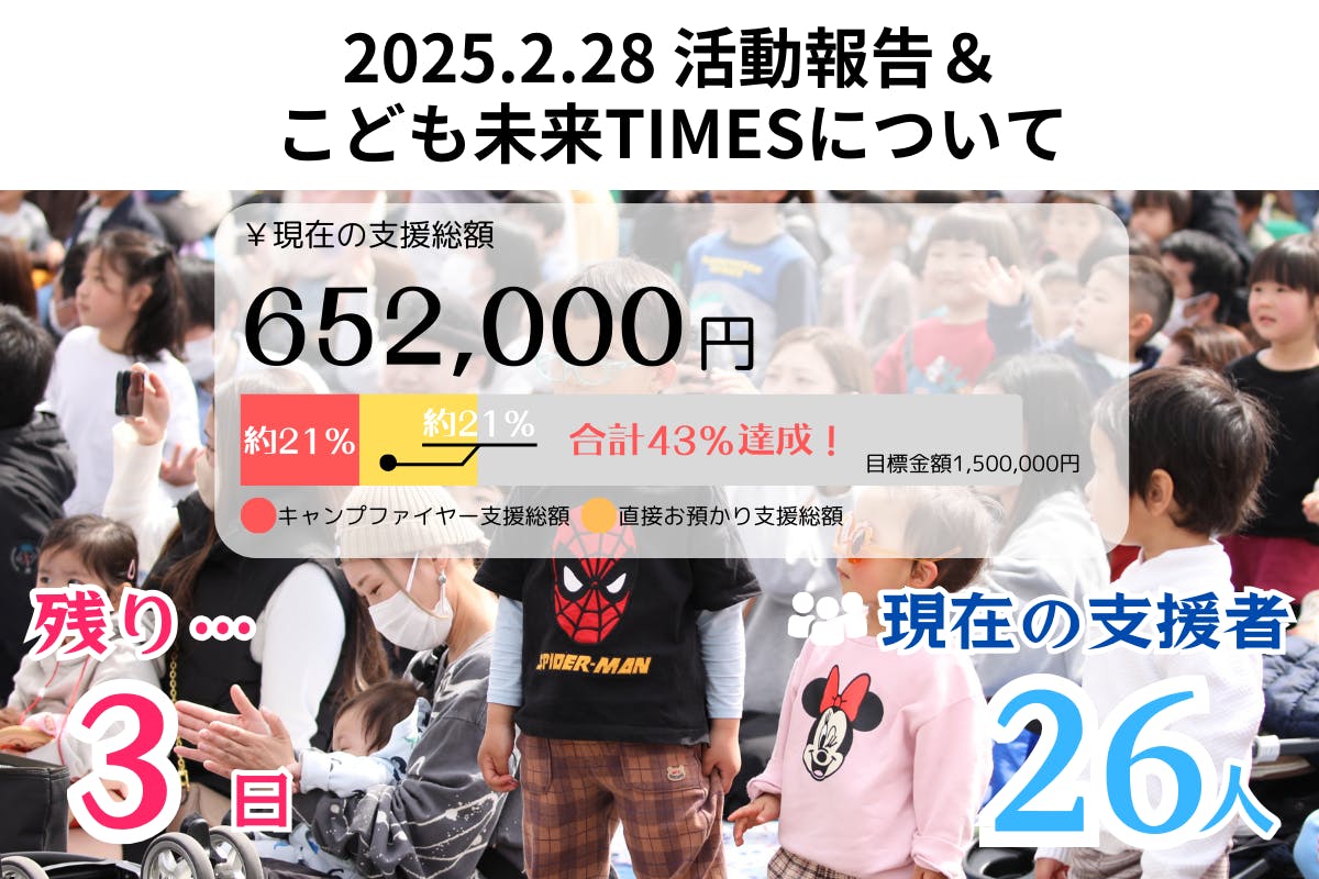 2025/02/28 17:36皆さま、温かいご支援をありがとうございます。現在、こども未来フェスへの支援総額は652,000円 に到達し、残り3日 となりました。これまでに26名 の支援者の方々が、こどもたちの未来のために力を貸してくださっています。こども未来TIMESのイメージが完成今回、新たに**「こども未来TIMES」**のイメージが完成しました。このこども未来TIMESでは、こどもたちの未来を支える大人たちの想いイベントの見どころや活動報告未来をつくるプロジェクトの紹介などを掲載し、こどもたちと社会をつなぐ役割を担います。支援者の皆さまのご紹介ご支援いただいた皆さまは、こどもの未来づくりに力を注いでいる方々 として、こども未来TIMESの中でご紹介させていただきます。詳しくは、リターン内容をご確認ください。今年は10,000人に届けたい昨年は当日5,000人 の方々にこども未来TIMESをお配りしましたが、今年は10,000人以上 に届けられるよう、さらに盛り上げていきます。残り3日、最後まで多くの方に届けられるよう、引き続き応援よろしくお願いいたします。 もっと見る