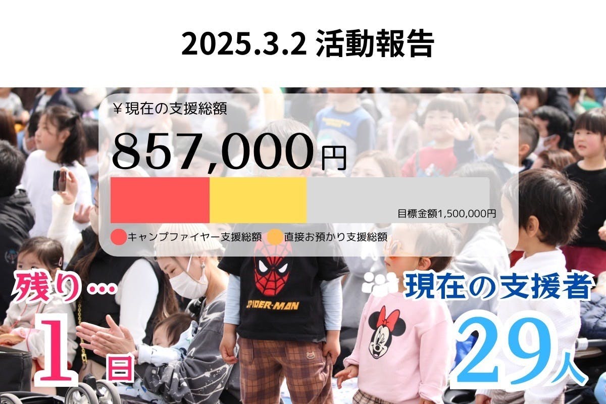 2025/03/03 15:06クラウドファンディングもついに 残り9時間 となりました。現在、29名の方々から857,000円のご支援 をいただいています。目標の1,500,000円にはまだ届いていませんが、ここまでたくさんの方に応援していただき、想いが広がっていくのを実感しています。本当にありがとうございます。このプロジェクトを立ち上げたとき、「どれだけの人が共感してくれるだろうか?」と不安もありました。でも、こうして多くの方が支えてくださり、応援の言葉を届けてくださったことで、改めて 「やってよかった」「この先も絶対に続けていく」 という気持ちが強くなりました。そして今日、地域の小学校や幼稚園、保育園にお配りするチラシの発送準備が終わりました。これから、それぞれの市へ届けに行きます。この想いが、こどもたちに届きますように。ゴールまでの道のりはまだありますが、最後まで走り抜けます。最後の最後まで、想いを届け続けます。一緒に、未来をつくる仲間になってください!どうか ラストスパートの応援 をよろしくお願いします! もっと見る