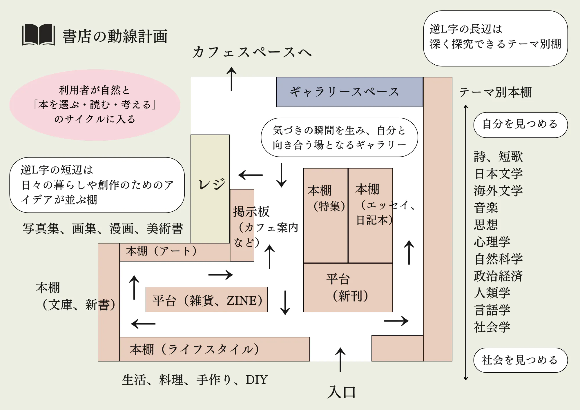 書店全体の動線は、社会を見つめるところから始まり、自分を深く見つめ直し、そしてその気づきを日々の生活や表現に生かす旅路として設計されています。訪れる人が本を通じて新たな自分と出会い、次の一歩を踏み出すための空間となれば幸いです。