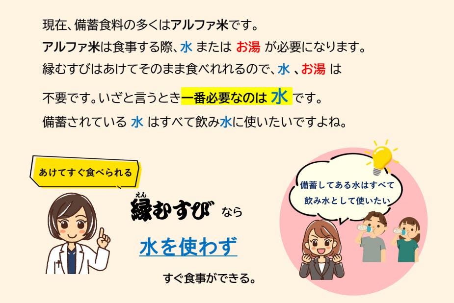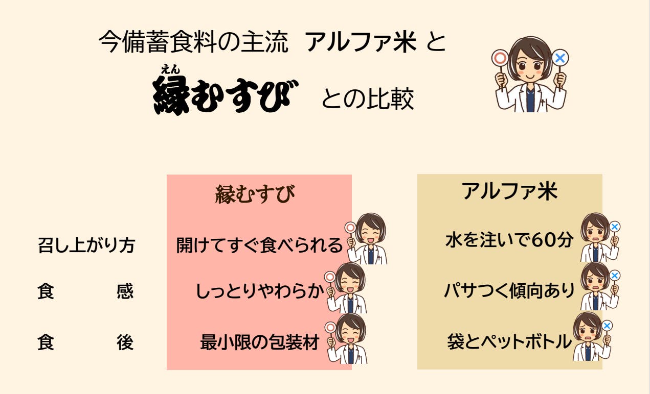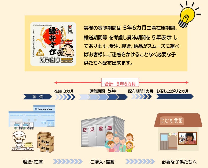 長期保存の備蓄おにぎりを開発・製造・販売いたします。アレルギー物質28品目不使用、しっとりやわらかくお子様からシニアの方までおいしく召し上がっていただけます。また、国産米使用・国内製造により安全・安心・美味しいおにぎりを、明日起こるかもしれない災害に備え、多くの方に備蓄してほしいと考えています。