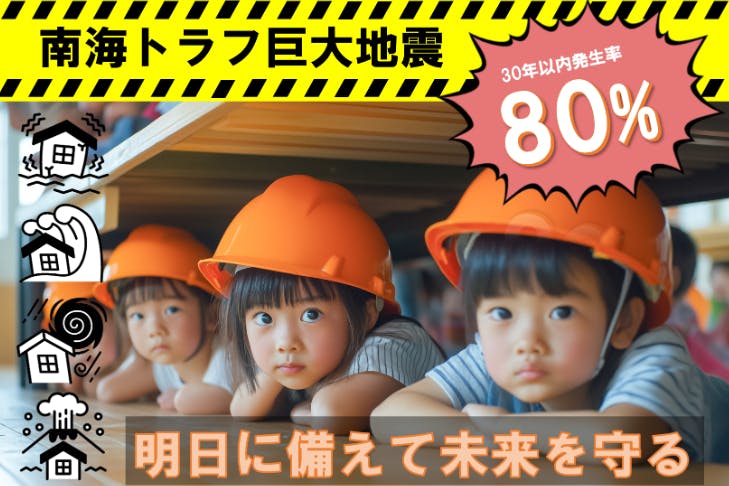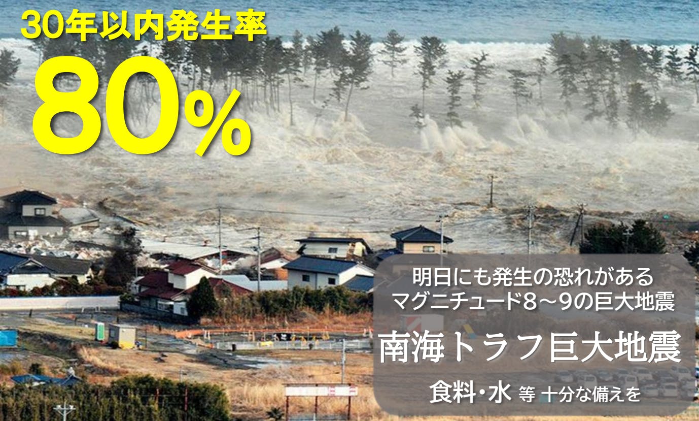 政府は今年、南海トラフ巨大地震発生率を 80% に引上げました。大切な人と自分のために今、そなえが必要です!