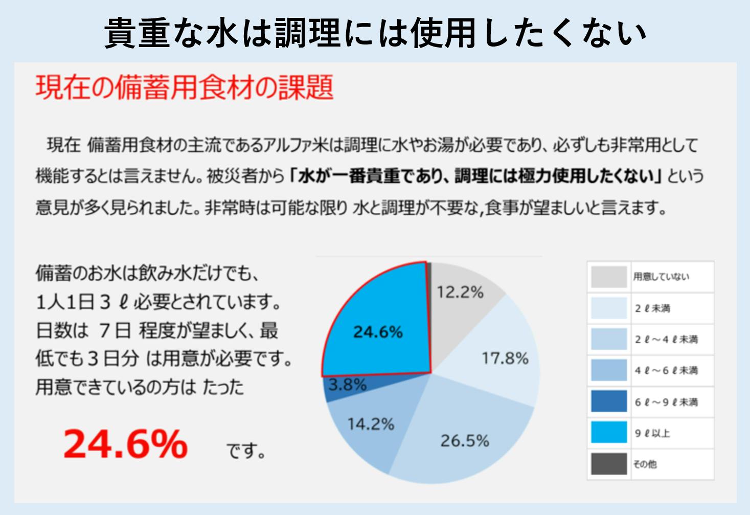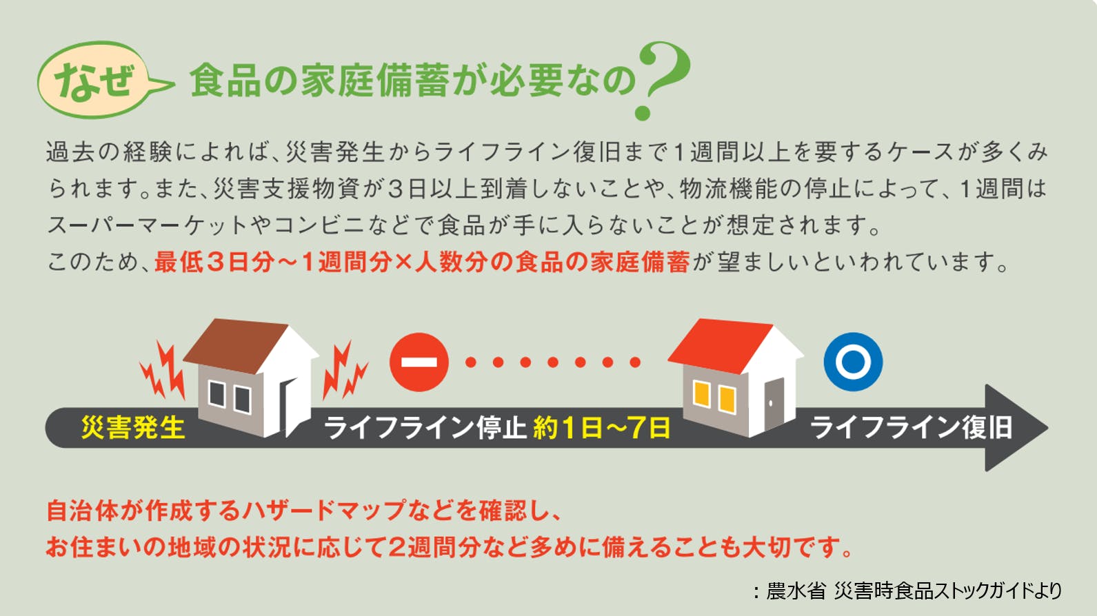 地震大国日本では活動地域に、南海トラフ巨大地震・首都直下型地震など多数予測されています。私たちは十分な備えが必要だと言われています。政府の世論調査では、食料を備蓄している人の割合はわずか、まだまだ十分ではありません。大切な人と自分のために備蓄していただきたいと思いプロジェクトの立ち上げに至りました。
