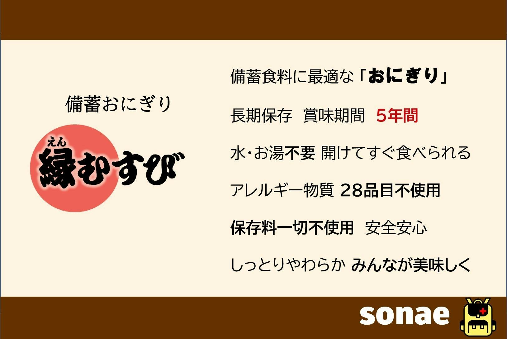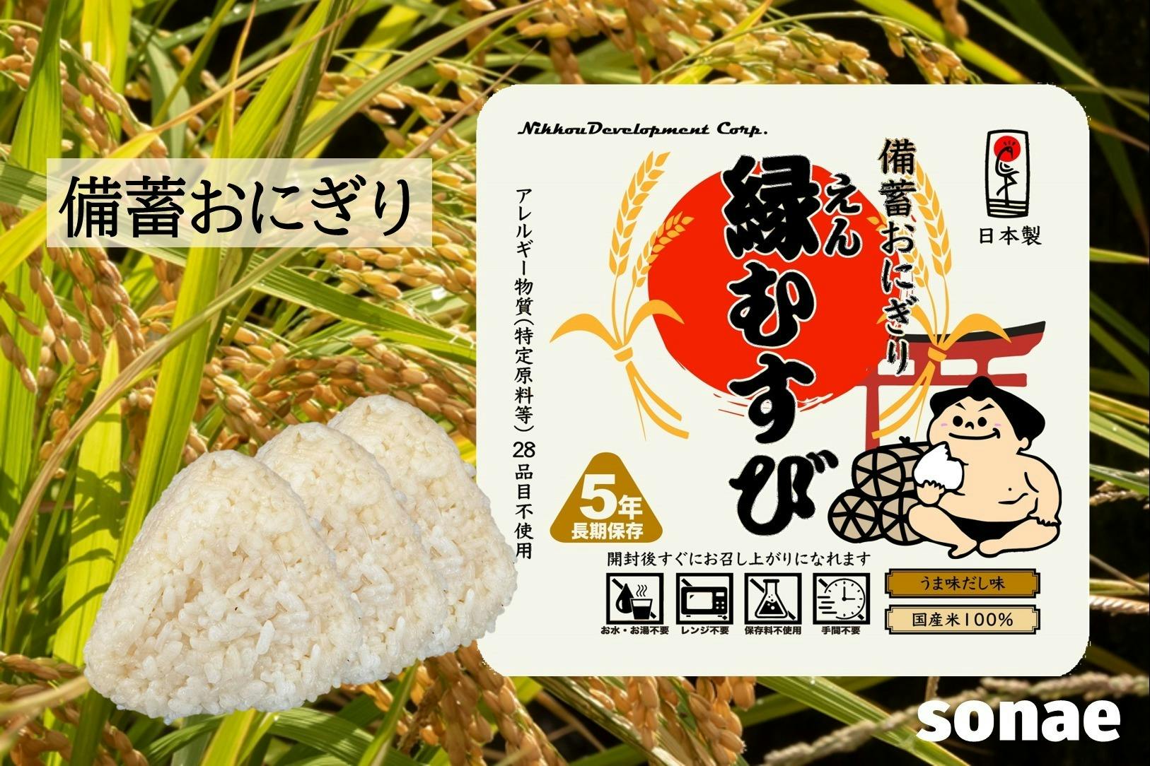 備蓄おにぎり【縁むすび】賞味期限5年、アレルギー物質(特定原料等)28品目不使用 をリターン品とします。どなたでもすぐ食べられ国産米100%で国内製造、ゴミも少ない常温保存のレトルト食品です。