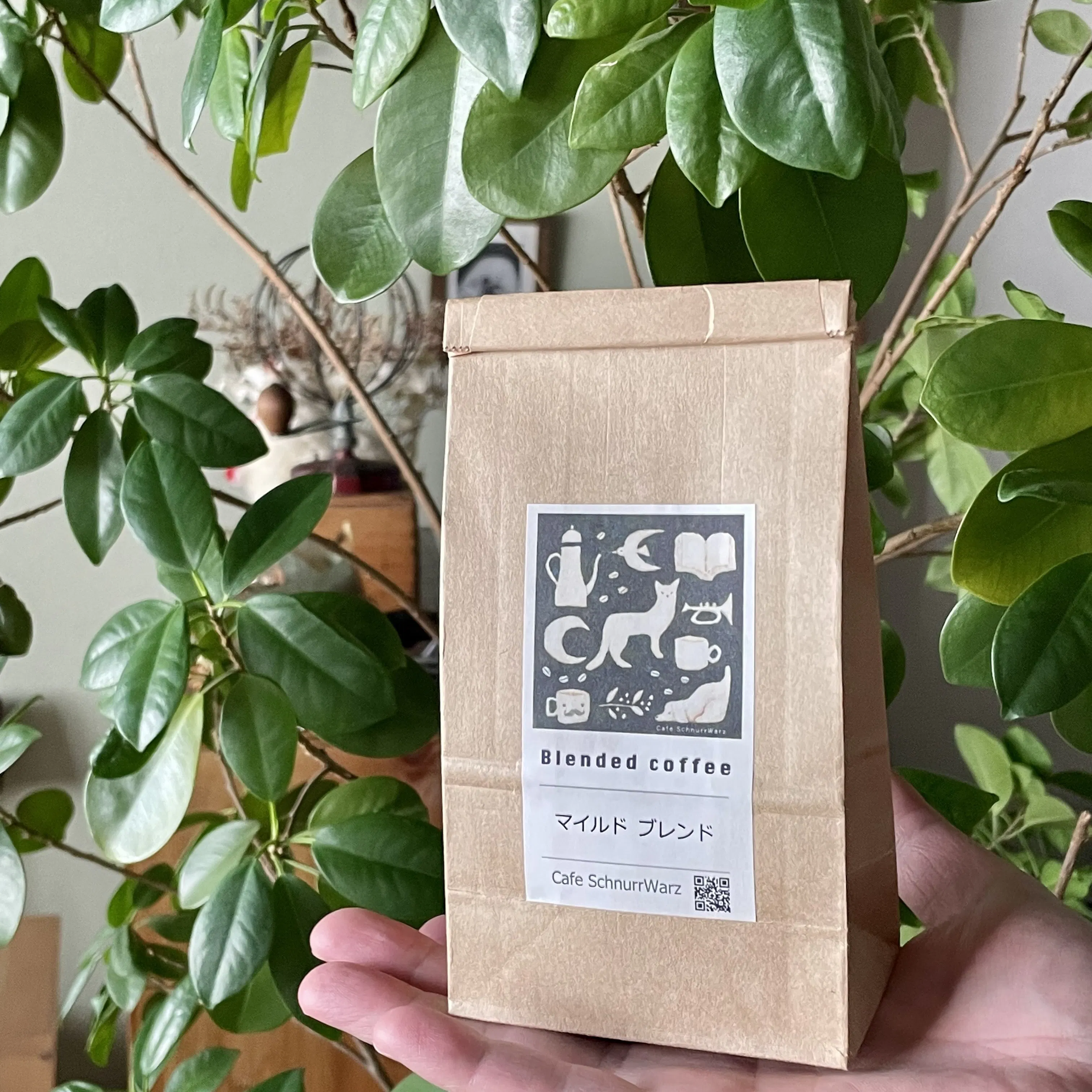 ・あれこれたっぷり入るトートバッグ、珈琲豆がいくつか入る小さめバッグ、Tシャツ、今まで作ったことのなかったCafe SchnurrWarzグッズです。イラストはオオタサトシさんが描いたもの、Cafe SchnurrWarzロゴマークでご用意します。