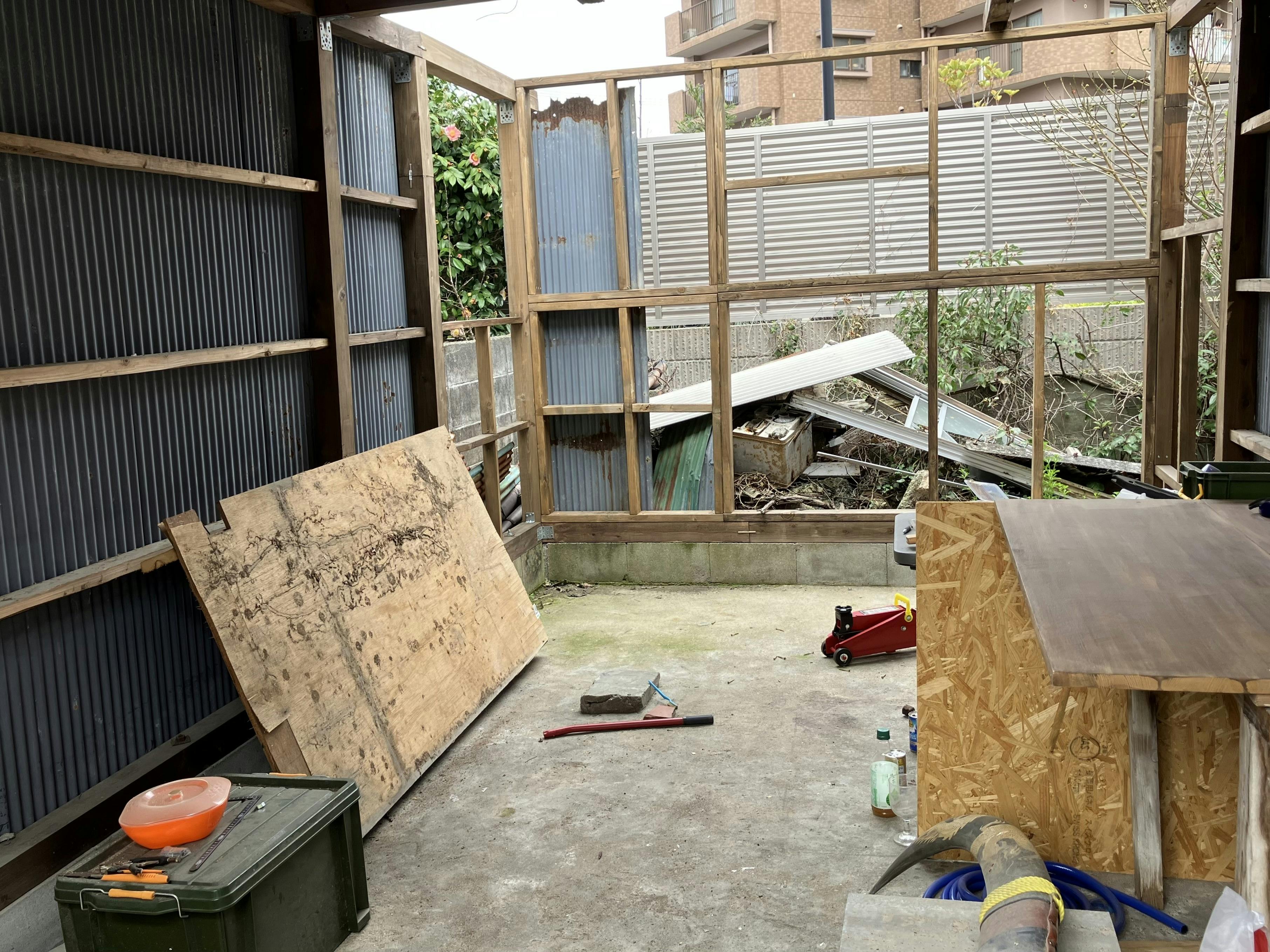 作業台以外、取り壊しが完了。建物周りを少し片付けて建物自体の補強改修に進んでいきます。本格的な改修はチャレンジ終了後になりますが。