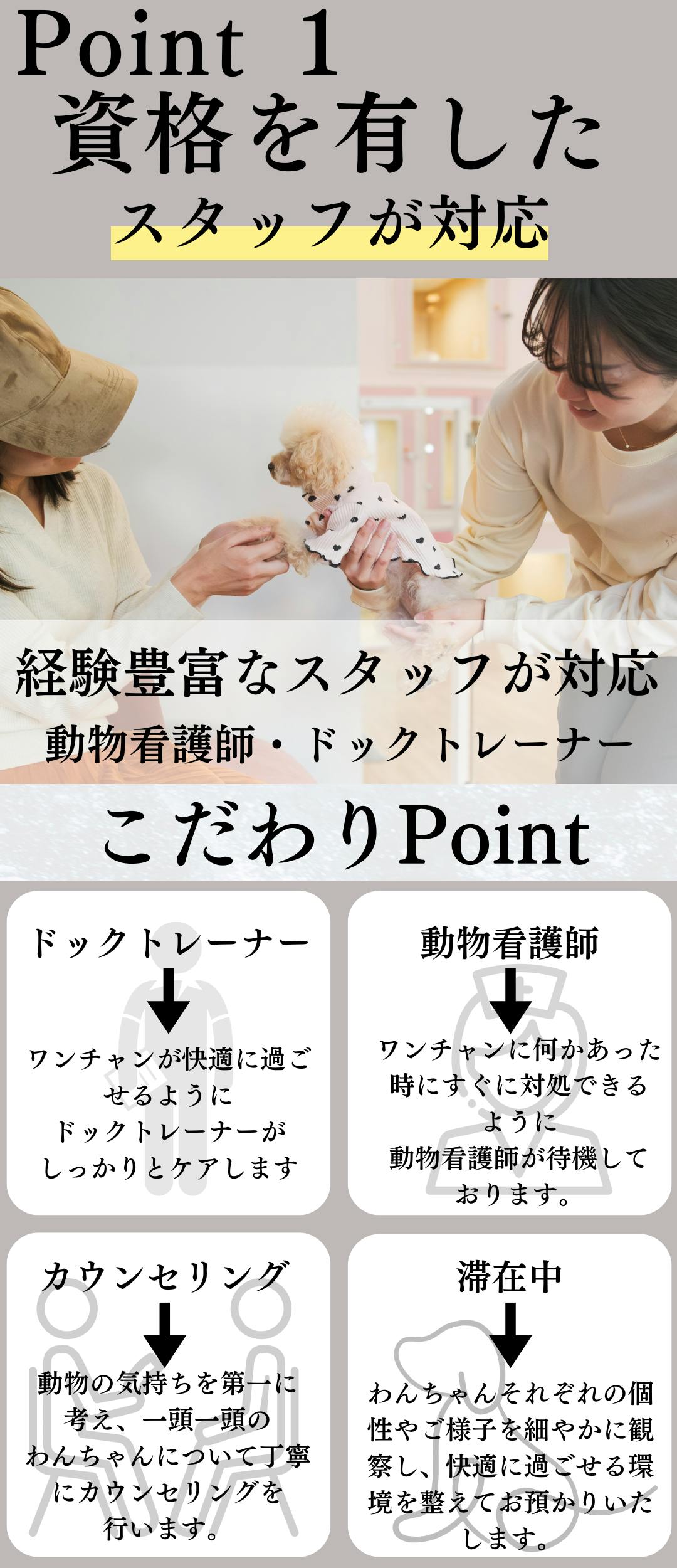 動物看護師、ドッグトレーナー、トリマーなど、専門知識と経験を持った4名のスタッフがチームとなり、愛犬たちに愛犬に贅沢なひと時を過ごしてもらうため日々活動しております。