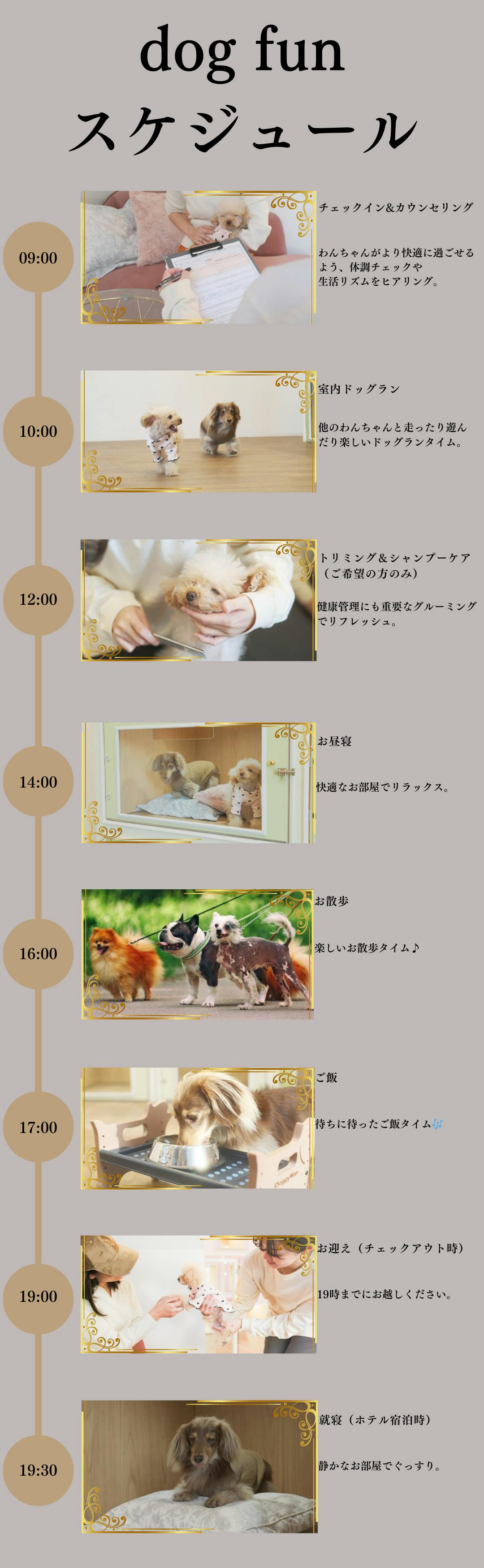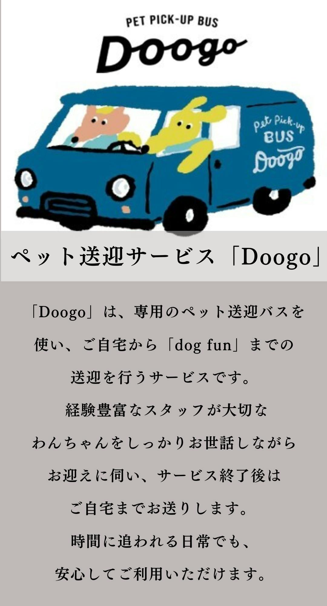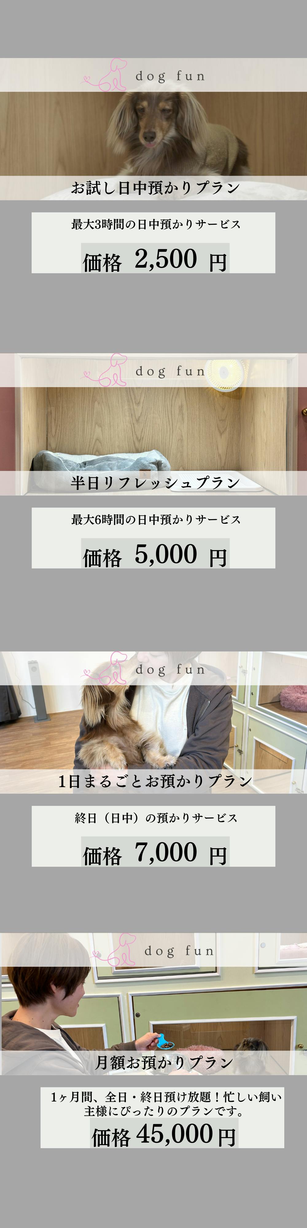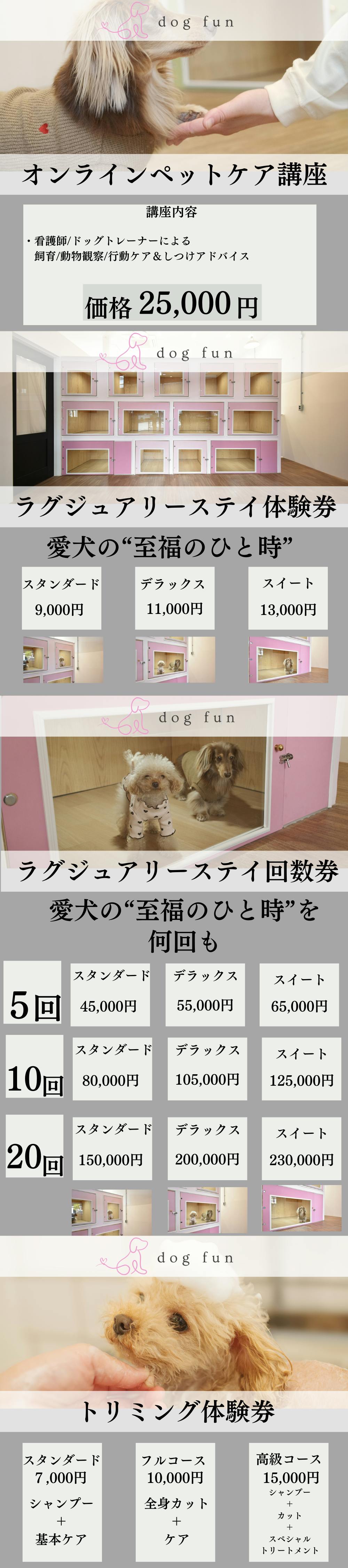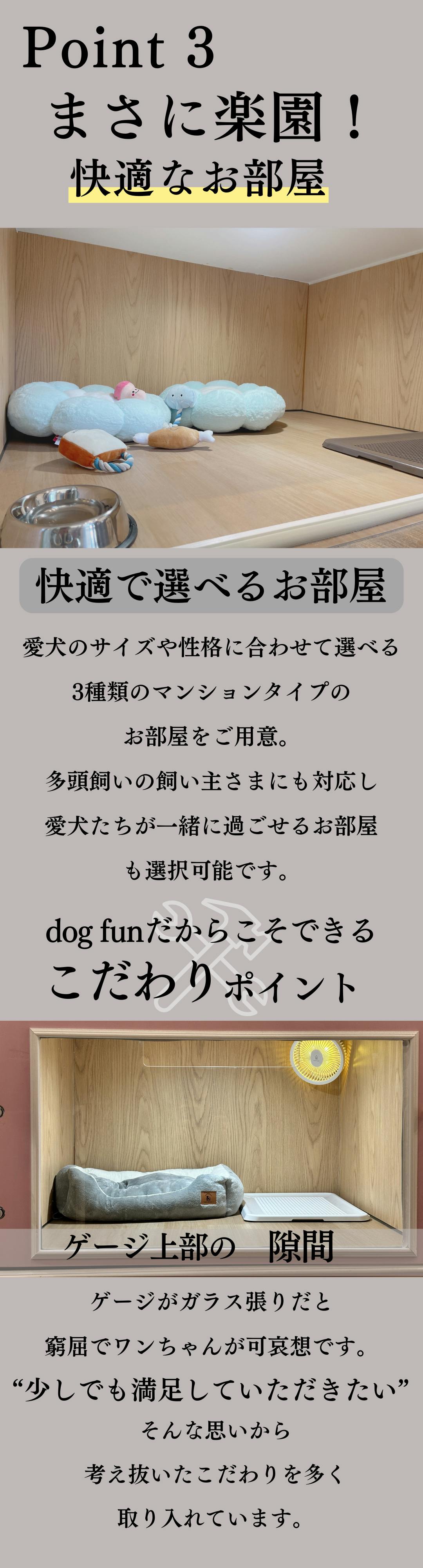 この規約は、当店dog funをご利用いただく際の飼い主様との関係やご利用条件を定めるものです。本規約は、当店利用におけるすべての事項に適用されます。=====第1条:ご利用料金および予約について以下の条件が確認された場合、当店はご予約やご利用をお断り、または一部サービスを制限・キャンセルする場合があります。【攻撃性が強い、狂犬病ワクチン及び5種以上の混合ワクチンを未接種、著しい健康状態の悪化、重篤な持病、妊娠・発情期、著しい悪天候や天災、パンデミックによる営業自粛、スタッフの健康状態により営業が困難な場合】事前予約やカウンセリングの際には、以下の情報を正確にお伝えください。内容が事実と異なる場合や不正確な情報があった場合、サービスを制限・キャンセルすることがあります。【犬種、年齢、性格、生活習慣、健康状態、病歴、体重、住所、連絡先】また、ご利用料金や規約の変更については当店ホームページで告知しますので、お申し込み前に必ずご確認ください。第2条:急変や事故の免責事項飼い主様がご用意されたリードやクレート、サークルの不具合により発生した事故、逃走、死亡については責任を負いかねます。また、利用中にわんちゃんの体調が悪化した場合、サービスを一時中断し、飼い主様へご連絡の上スタッフの判断に基づき獣医師の診察を受けていただきます。その際の診察費用は飼い主様負担となりますが、搬送や付き添いにかかる料金はいただきません。ただし、店舗の状況により、診察終了まで付き添えない場合があります。ご利用中・ご利用後の体調変化や不可抗力による事故、負傷、死亡などについては一切の責任を負いかねます。ただし、当方の重大な過失が明確であると判断された場合に限り、この限りではありません。以下の行為が確認された場合は法的措置を取らせていただきます。【当店に明確な過失が認められない状況での損害賠償請求や、SNS等における批判・誹謗中傷、虚偽の噂などで当店が損失を被る行為】ご用意いただいた物の破損に関する補償はいたしかねます。また、不可抗力による事故についても補償はできません。第3条:お預かり条件環境変化や飼い主様との離別による体調不良・負傷につきましては賠償責任を負いかねます。ワンちゃんに合わせた事前のお泊り練習をお願いいたします。ノミ・ダニの予防・駆除を事前に行ってください。発見した場合は、ノミ駆除シャンプーを有料で行います。また、次の条件に当てはまる場合、ドッグランスペース外のお部屋でお預かりする場合があります。【排泄物が多い、マナーウェアを着用できない、施設や備品の破壊行為がある、攻撃的行為や興奮行動がある、分離不安が顕著な場合、骨折・脱臼歴がある、脱走行動が予見される場合】当ホテルは24時間体制ではございません。清掃や他の対応でスタッフが離れる時間があることをご理解ください。お預かり期間を過ぎてもお引き取りがない場合、一定の期間後、警察へ届け出を行い、所有権が当店へ移ることがあります。第4条:健康状態の告知義務以下の条件に該当する場合は事前にお知らせください。告知がなかったことによるトラブルについて、当店は責任を負いかねます。【先天性および後天的な疾患、10歳以上の高齢、体調不良(外傷を含む)、生理中、投薬が必要な場合、噛み癖がある場合、事実に反する情報を告知した場合】第5条:高齢犬や持病がある場合高齢や持病があるわんちゃんは、新しい環境で負傷や体調変化が生じる可能性があることを十分ご理解の上でご利用ください。特に新しい体験や環境が不安や緊張を生み、リスクを増す可能性があります。第6条:キャンセルポリシーご利用当日、および利用開始後のキャンセルは全額、前日のキャンセルは半額をお支払いいただきます。第7条:利用停止について当規約に反する行為が確認された場合、利用停止措置を取らせていただくことがあります。=====