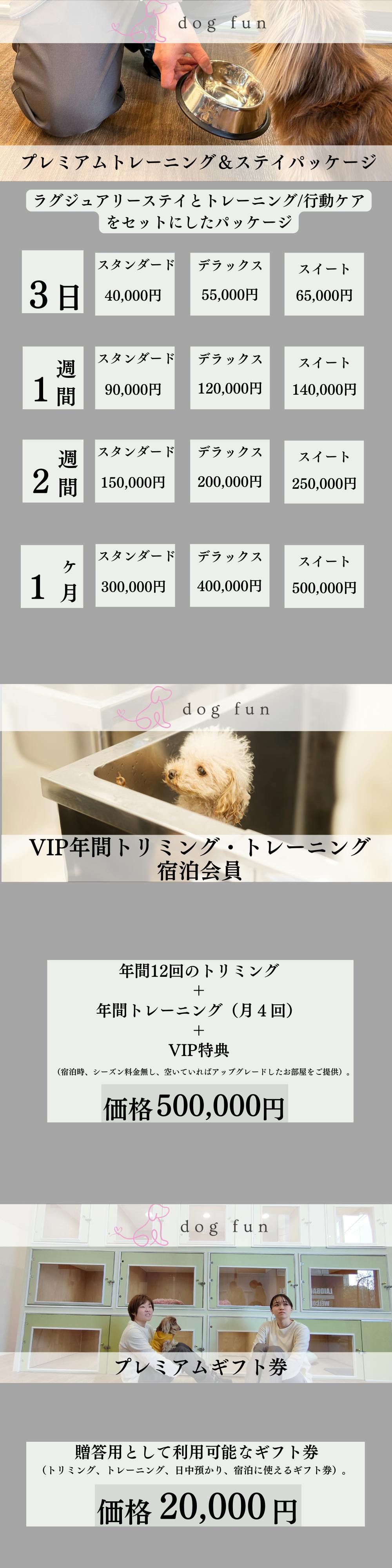 ・内容: 年間12回のトリミング+年間トレーニング (月4回)+VIP特典 (宿泊時、シーズン料金無し、空いていればアップグレードしたお部屋をご提供)