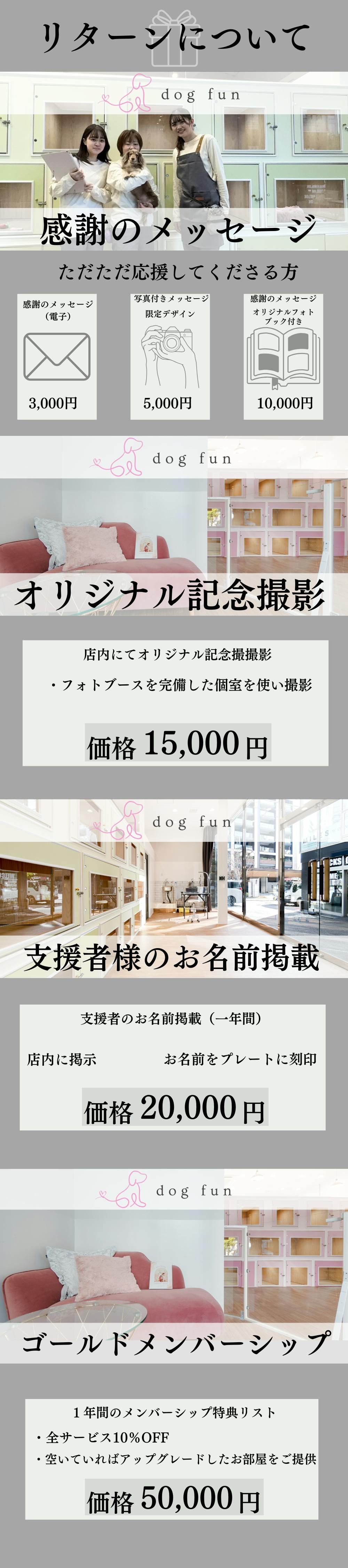 2025/01/18 19:04こんにちは!「dog fun」を応援いただきありがとうございます。愛犬に「ちょっと贅沢な体験」をプレゼントしませんか?今回ご紹介するクラウドファンディング限定の ラグジュアリーステイ体験券 は、特別価格に加え、シーズン料金なしでご利用いただける超お得な内容です!1.スタンダードステイ:9,000円・シンプルで快適な滞在プラン清潔で広々としたスペースで、わんちゃんが安心して過ごせる環境をご提供します。通常価格より最大以上1,000円お得!2.デラックスステイ:11,000円・さらに快適なステイプランスタンダードステイよりも広めのお部屋で、わんちゃんがよりリラックスできる滞在を実現。ゆったりとした空間で特別な時間をお過ごしください。通常価格より最大2,000円以上お得!3.スイートステイ:13,000円・最上級の贅沢を味わえるプラン広々とした特別なお部屋で、愛犬が最高の快適さを感じられる環境をご用意しました。特別な日のご利用にも最適です。通常価格より最大3,000円以上お得!シーズン料金不要でさらにお得!通常、繁忙期には追加で発生することの多いシーズン料金をいただきません。これにより、どの季節でも安心してご利用いただけます!「dog fun」の安心ステイわんちゃんが初めての宿泊でも、スタッフが一頭一頭に目を配り、安心して過ごせるようサポートします。「ここに預けてよかった!」と思える環境とサービスをお届けすることをお約束します。なぜ支援する価値があるのか?1. お得感:特別価格+シーズン料金なしで通常より大幅にお得!2. 安心感:清潔で快適な環境、わんちゃんの個性に合わせたおもてなし。3. 応援の形:「dog fun」の未来を支援し、わんちゃんと飼い主さんがもっと幸せに過ごせる場を一緒に作り上げましょう!「愛犬へのご褒美をあげたい」「大切な子を安心して預けたい」そんな皆さまにピッタリのリターン品です!クラウドファンディング限定のお得な価格を、ぜひお見逃しなく もっと見る