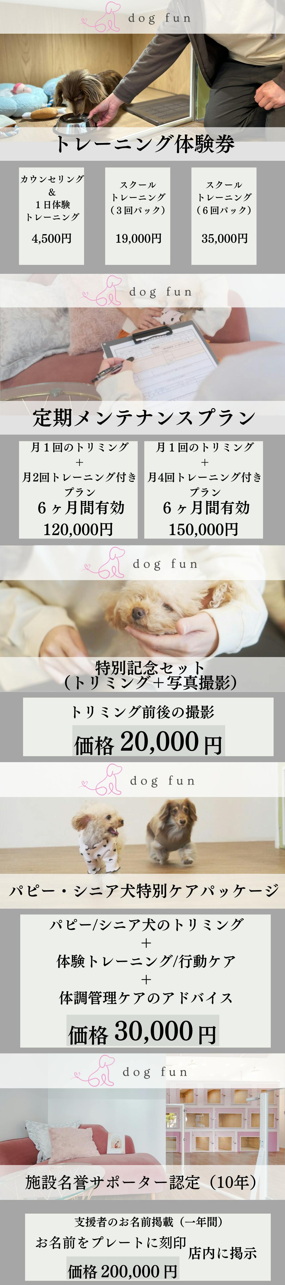 2025/01/18 16:01「dog fun」のリターン品を応援価格でご提供!こんにちは!「dog fun」をご覧いただき、ありがとうございます。わんちゃんの健康と笑顔のために、私たちは日々心を込めて活動しています。そんな私たちのクラウドファンディングでは、わんちゃんも飼い主さまも笑顔になれる 限定リターン品 をご用意しました!1.スタンダードコース:7,000円・内容:シャンプー+基本ケア(爪切り、耳掃除、足裏バリカンなど)・通常価格より1,500円以上お得!「毎日のケアがもっと楽しくなる!」プロの技術で皮膚・毛の健康を整え、清潔で快適な仕上がりをお届けします。2.フルコース:10,000円・内容:全身カット+シャンプーケア・通常価格より2,000円以上お得!「わんちゃんの魅力を最大限引き出します!」わんちゃんに似合うカットスタイルをプロが提案。仕上がりを見て感動すること間違いなしです。3.高級コース:15,000円・内容:全身カット+シャンプーケア+スペシャルトリートメント・通常価格より4,000円以上お得!「極上のケアでわんちゃんに特別なご褒美を!」スペシャルトリートメントは、わんちゃんの皮膚や毛の状態に合わせ、オプションメニューから最適なケアを1つ~選択します。丁寧なカウンセリングを通じて、飼い主さまと一緒に最適なプランをご提案します。さらにお得情報!チワワやダックスフンド(スムース)など、通常価格がコース以下の犬種には、スペシャルトリートメントを特別に追加!愛犬にとって最高の仕上がりを体感してくださいなぜ支援する価値があるのか?1. お得感:通常価格よりも大幅にお得な価格で、プロフェッショナルなケアを体験できます。2. 愛犬の幸せ:リラックスできる環境で、心身ともに健康で輝くわんちゃんに。3. 応援の形:「dog fun」の未来を支援し、わんちゃんと飼い主さんが笑顔で集える場所を一緒に作り上げましょう!「支援する価値、あるな」と感じていただけたなら、それが私たちの喜びです。この機会に、愛犬へのご褒美と「dog fun」への応援をぜひ形にしてください! もっと見る