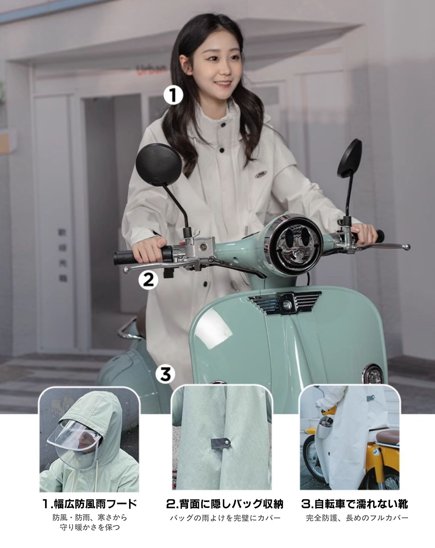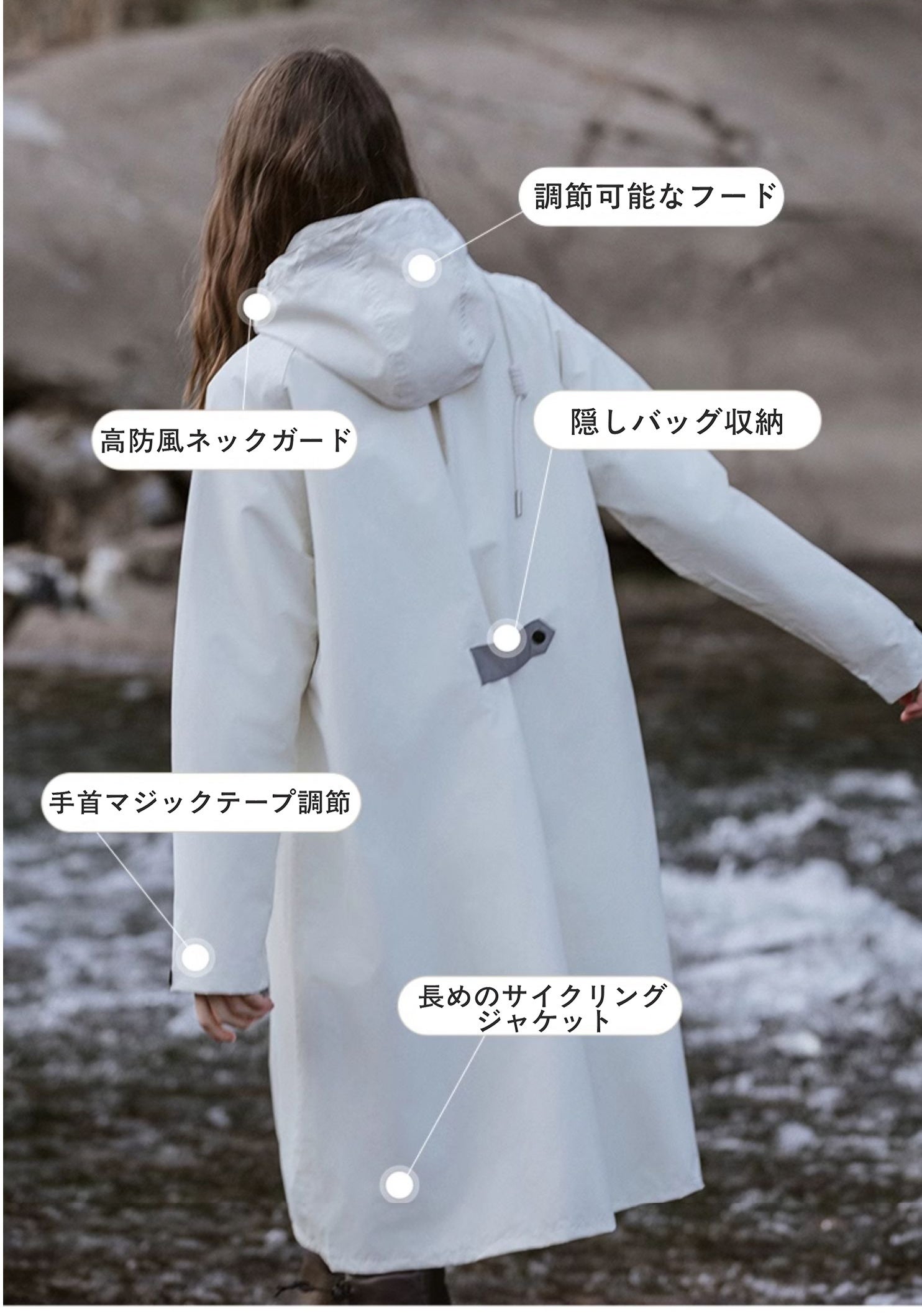 機能性を重視し、雨の日でも安心なロング丈デザインを採用。レインブーツと合わせれば、自転車での移動時も下半身の濡れを最小限に抑えられます。