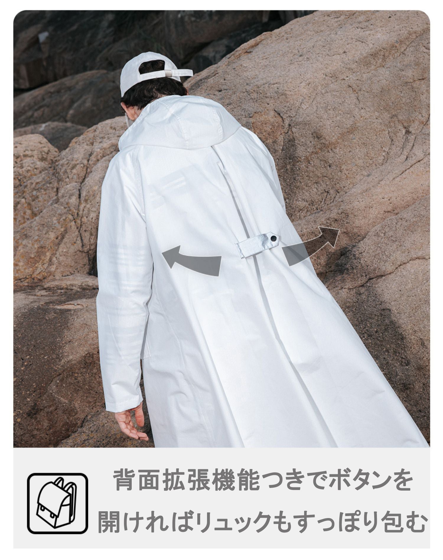 背中についているアジャスターボタンの開閉によって、ゆったり着たりすっきり着たりでき、たとえばボタンを開けてリュックを背負ったままでも使用OKです。