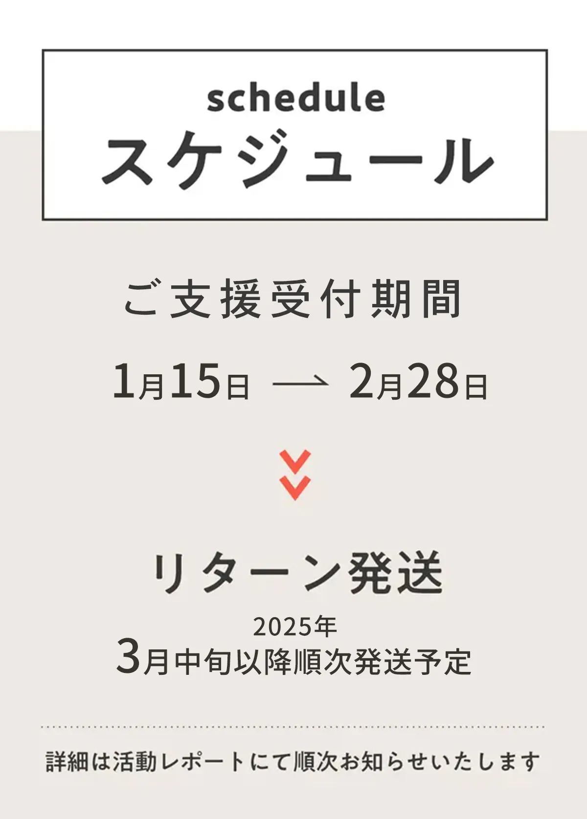2025/03/12 14:38株式会社トワイトでございます。この度はご支援いただきありがとうございました。現状3月21日〜25日ごろの配送予定でございます。お待たせしており申し訳ございませんが、発送まで今しばらくお待ちくださいませ。 もっと見る