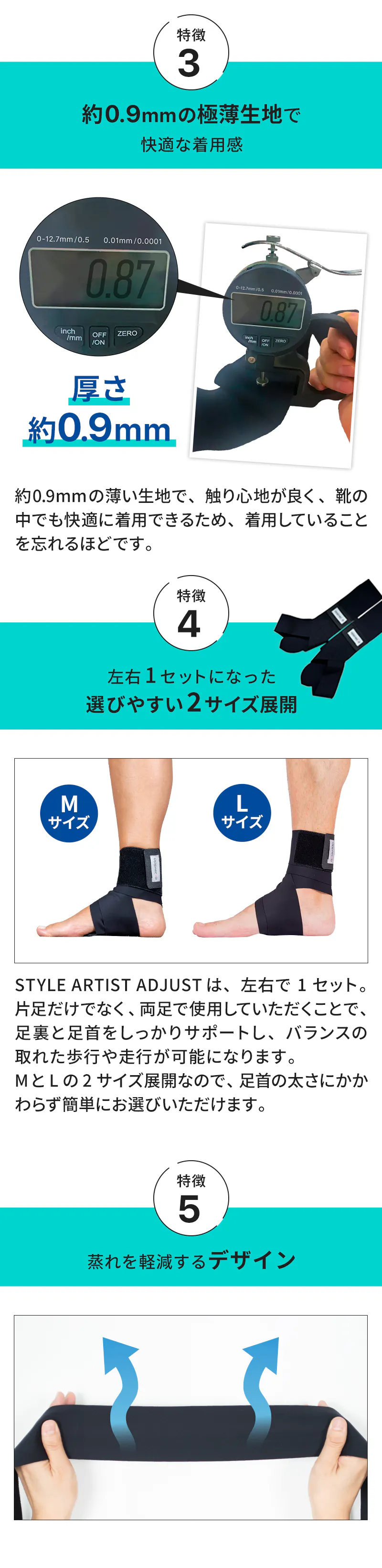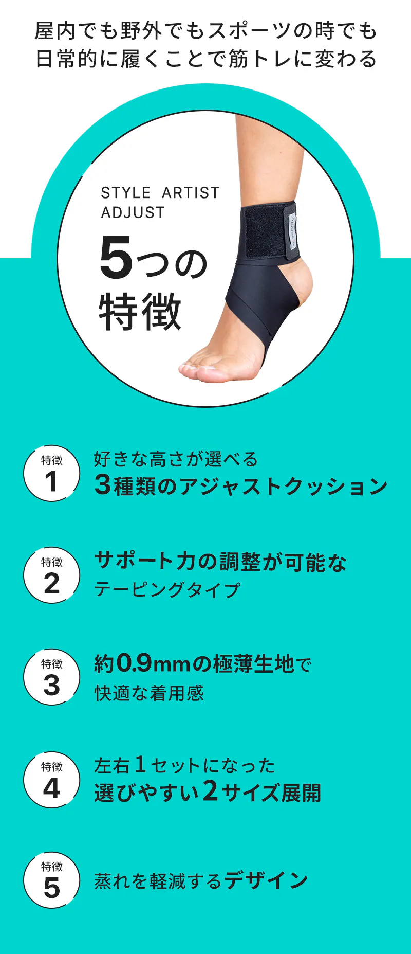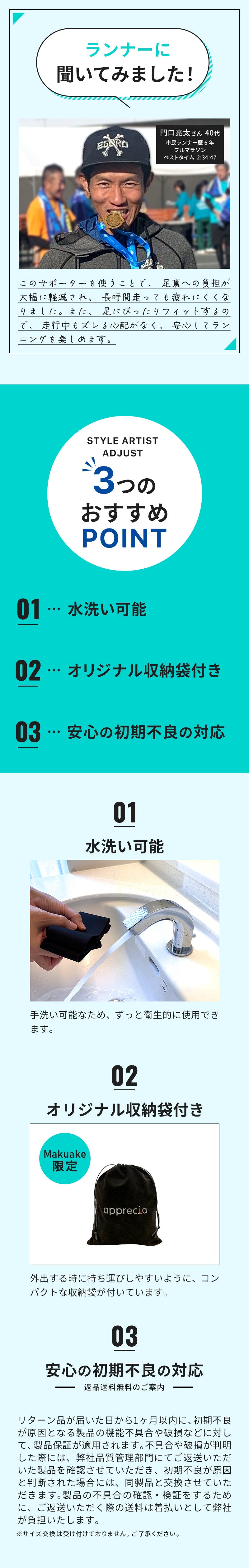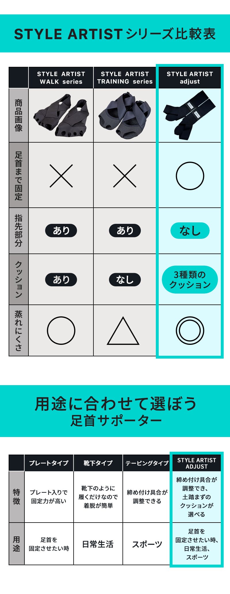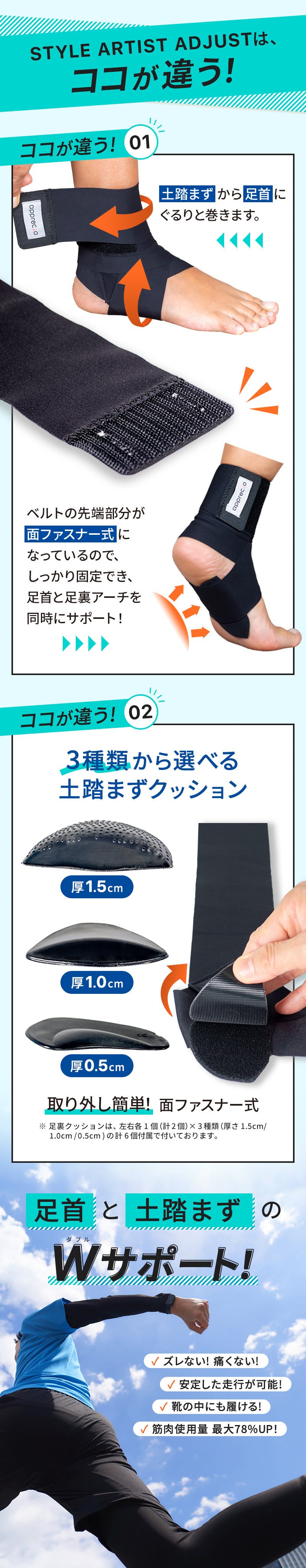 STYLE ARTIST ADJUSTは、固定力と動きやすさのバランスが良くスポーツの時に適切なテーピングタイプをベースに扁平足が気になる人にも使えるように選べる土踏まずのクッションをプラスした新しいタイプの足首サポーターです。