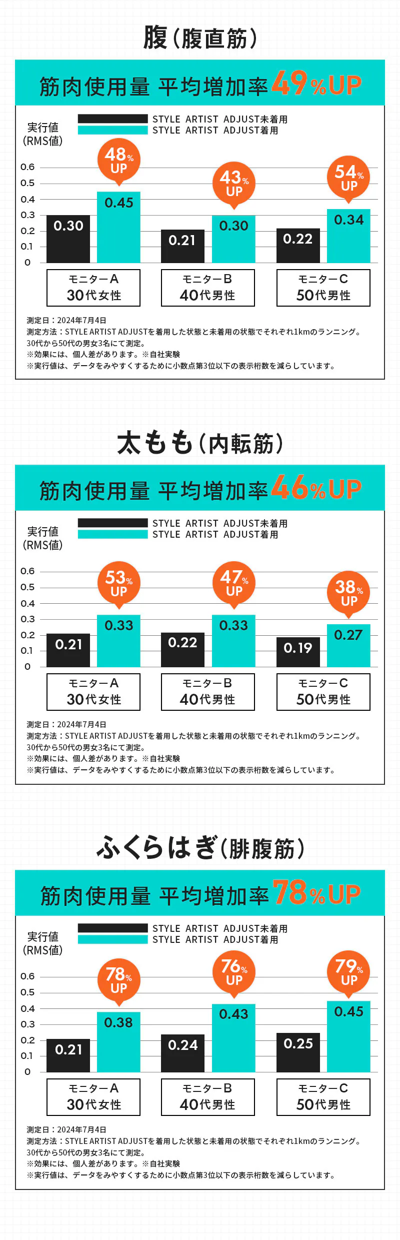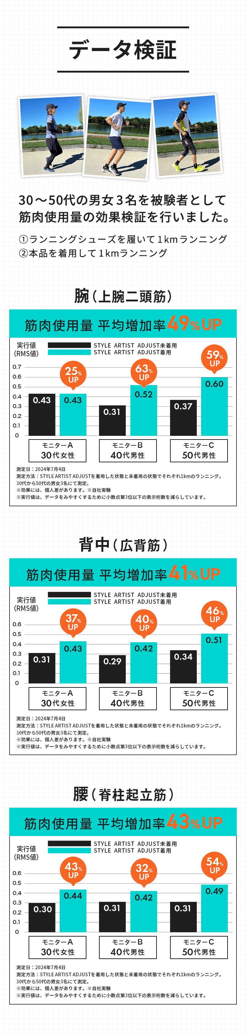 測定方法:STYLE ARTIST ADJUSTを着用した状態と未着用の状態でそれぞれ1kmランニング。30代から50代の男女3名にて測定