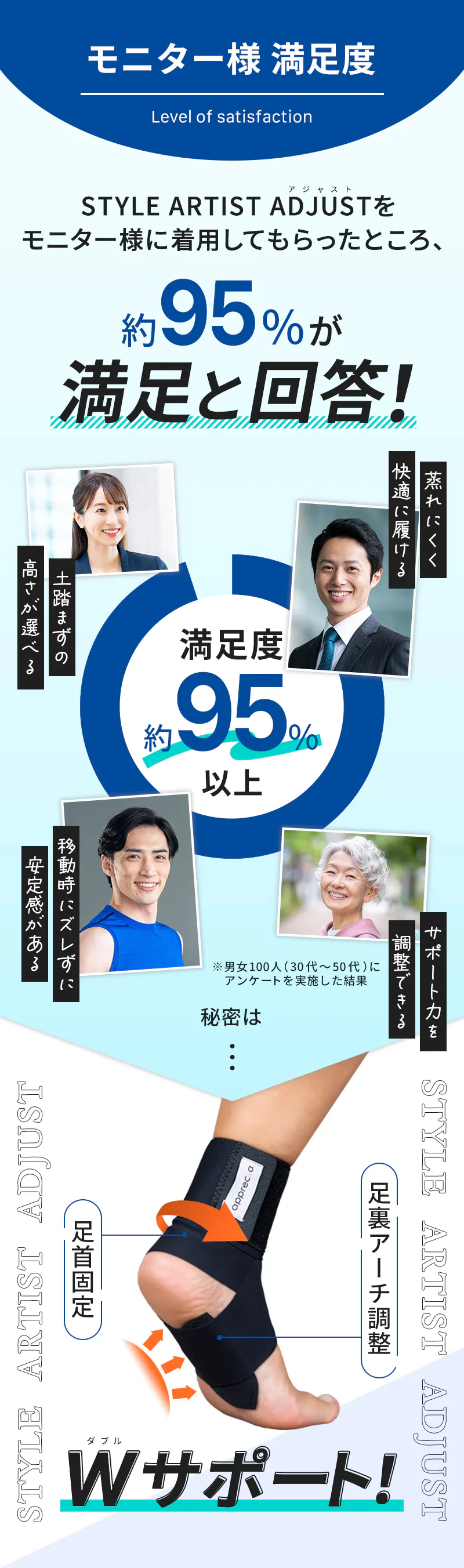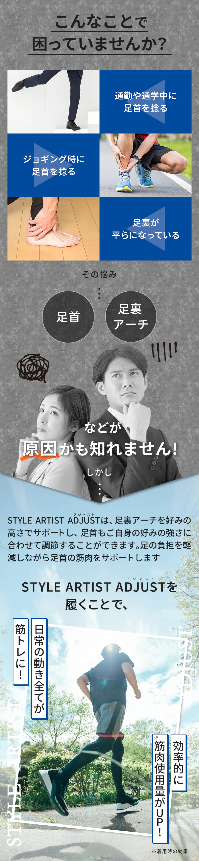 STYLE ARTIST ADJUSTは、従来のSTYLE ARTISTシリーズではサポートが出来なかった足首までサポートが可能!さらにサポート力の調整が可能。