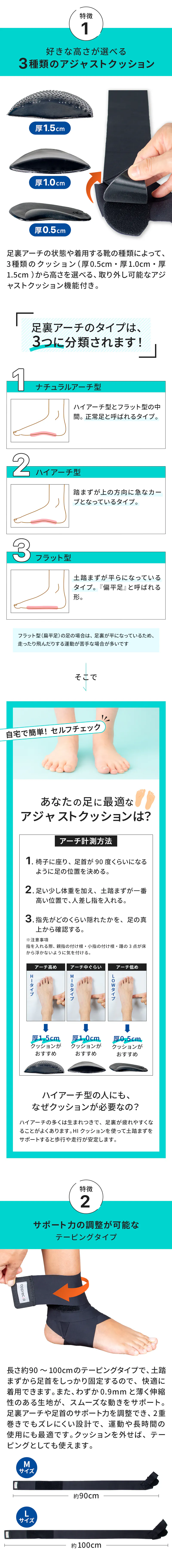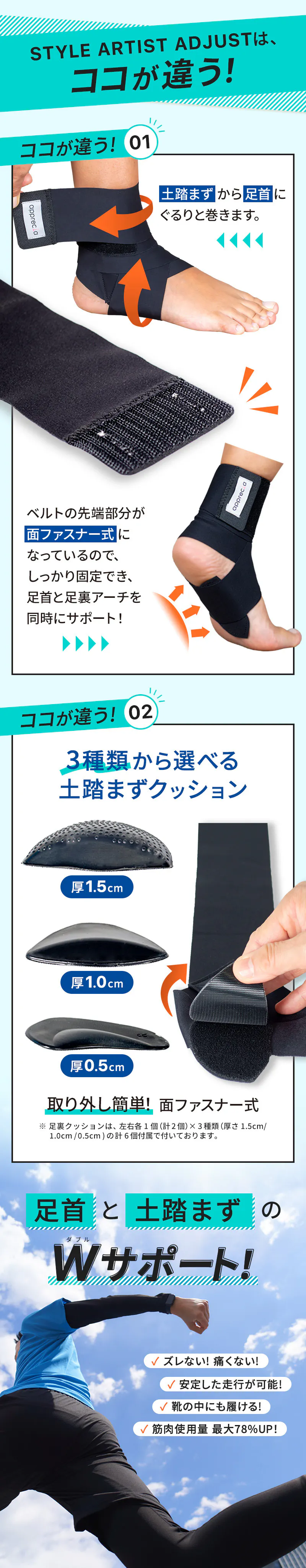 アーチのタイプで選べる土踏まずのクッションと足首を好きなサポート力で調整できるWのサポートが可能な足裏アーチサポーター