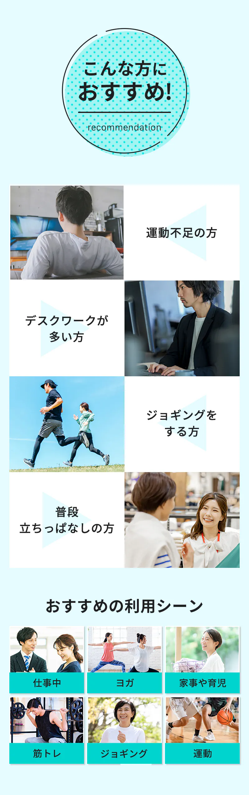 仕事中、ヨガ、家事や育児、筋トレ、ジョギング、運動