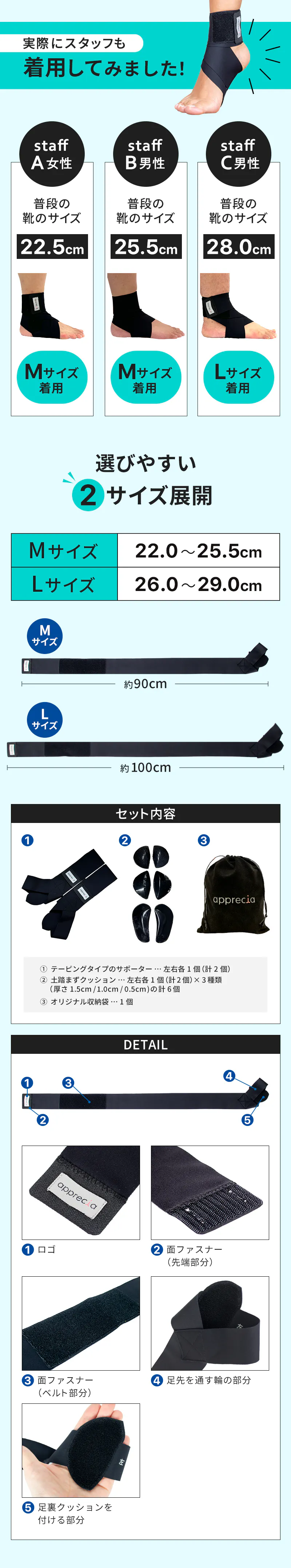 ●セット内容・テーピングタイプのサポーター左右各1個(計2個)・土踏まずクッション左右各1個(計2個)×3種類/計6個・オリジナル収納袋1個