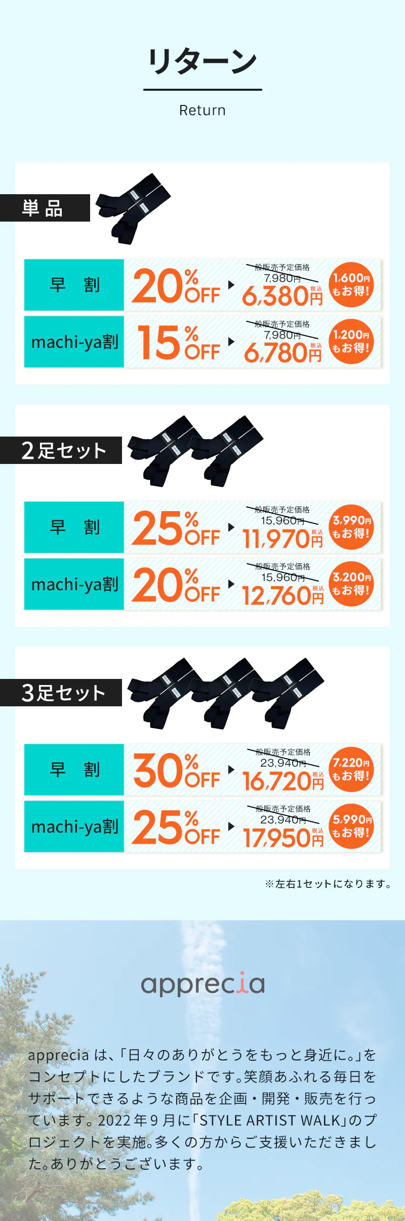 単品/2足セット/3足セット/5足セットを、早割・machi-ya割にてご用意しています。