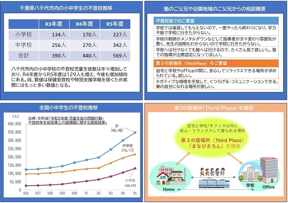私たちは、子どもたちが多様な学びを通じて、自らの可能性を広げ、未来を変える力を身に付けることを支援しています。新たに設置しる「まなびさろん」では、子どもたちに「変わるチャンス」を提供し、その変化が家族や地域、さらには社会全体に広がることを目指しています。このような取り組みを通じて、不登校のない社会の実現に寄与できればと考えています。