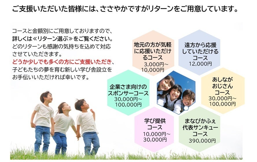 今回のクラウドファンディングでは、皆様にご支援いただいたお力を、子どもたちの為により良い環境への施設の引っ越しと、子どもたちの人と人とのつながりや「変わるキッカケ」づくりを提供するの為の「まなびさろん」設置に充当させて頂きます。