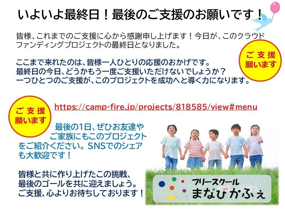 2025/04/01 10:52拝啓この度は、私たちのクラウドファンディングプロジェクト「フリースクール「まなびかふぇ」。子どもたちの夢を育む新しい学び舎へアップデート!」にご支援いただき、誠にありがとうございました。沢山の皆様からの温かいご支援を頂き、新しい学び舎に向けて大きく前進することができましたこと、心より感謝申し上げます。子どもたちの為に、人と人をつなぐ新しい形のフリースクールへ。こどもたちの夢を育む学び舎の夢が、一歩ずつ形になりつつあります。これもひとえに、皆様のご厚情と信頼に支えられてのことです。お寄せいただいたご支援は、スクール開設の準備や学びの環境整備に大切に活用させていただきます。プロジェクトに共感してくださった皆様とのつながりが、私たちの何よりの励みとなっております。引き続き見守っていただけますと幸いです。最後になりますが、皆様のご健康とご多幸を心よりお祈り申し上げます。改めまして、心からの御礼を申し上げます。敬具 もっと見る