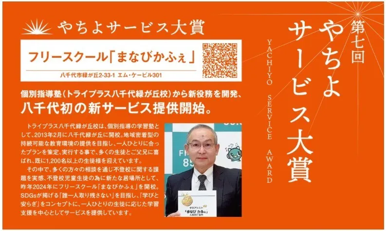 本日八千代商工会議所で、第7回やちよサービス大賞の授賞式があり、大賞を頂きフリースクール「まなびかふぇ」の活動について紹介させて頂きました。やちよサービス大賞とは、八千代商工会議所サービス部会が、市内全てのサービス事業者や会議所会員を対象として、優れたサービスをつくり、届けることに積極的に取り組んでいる事業者を表彰する制度。https://yachiyocci.jp/info/news/%e7%ac%ac%ef%bc%97%e5%9b%9e%e3%82%84%e3%81%a1%e3%82%88%e3%82%b5%e3%83%bc%e3%83%93%e3%82%b9%e5%a4%a7%e8%b3%9e%e6%b1%ba%e5%ae%9a/