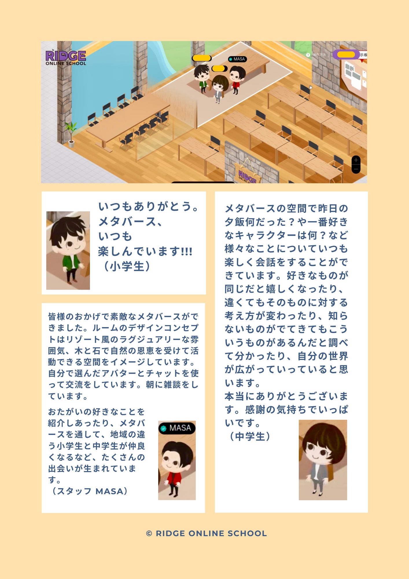2025/11/02 11:21RIDGE ONLINE SCHOOLのクラウドファンディングへの応援本当にありがとうございました! 現在、開校から6ヶ月が経過しました! ほぼ「満員状態」です!皆様の応援のおかげで、不登校の子供達がお家から未来への翼を身につけようとしています! 本当に毎日毎日、全国のお家からスクールにアクセスして楽しい学びを繰り広げています! この子達が「不登校」だなんて。。信じられません!本当に才能あふれる素晴らしい日本の宝を私たちがサポートできていることを誇りに思います。 クラファンで応援いただいたお金で「メタバース空間」を既存のものでなく、「オーダーメイド」で作って運用が始まりました。 生徒たちからお礼のメッセージが届いています!ぜひお読みください! もっと見る
