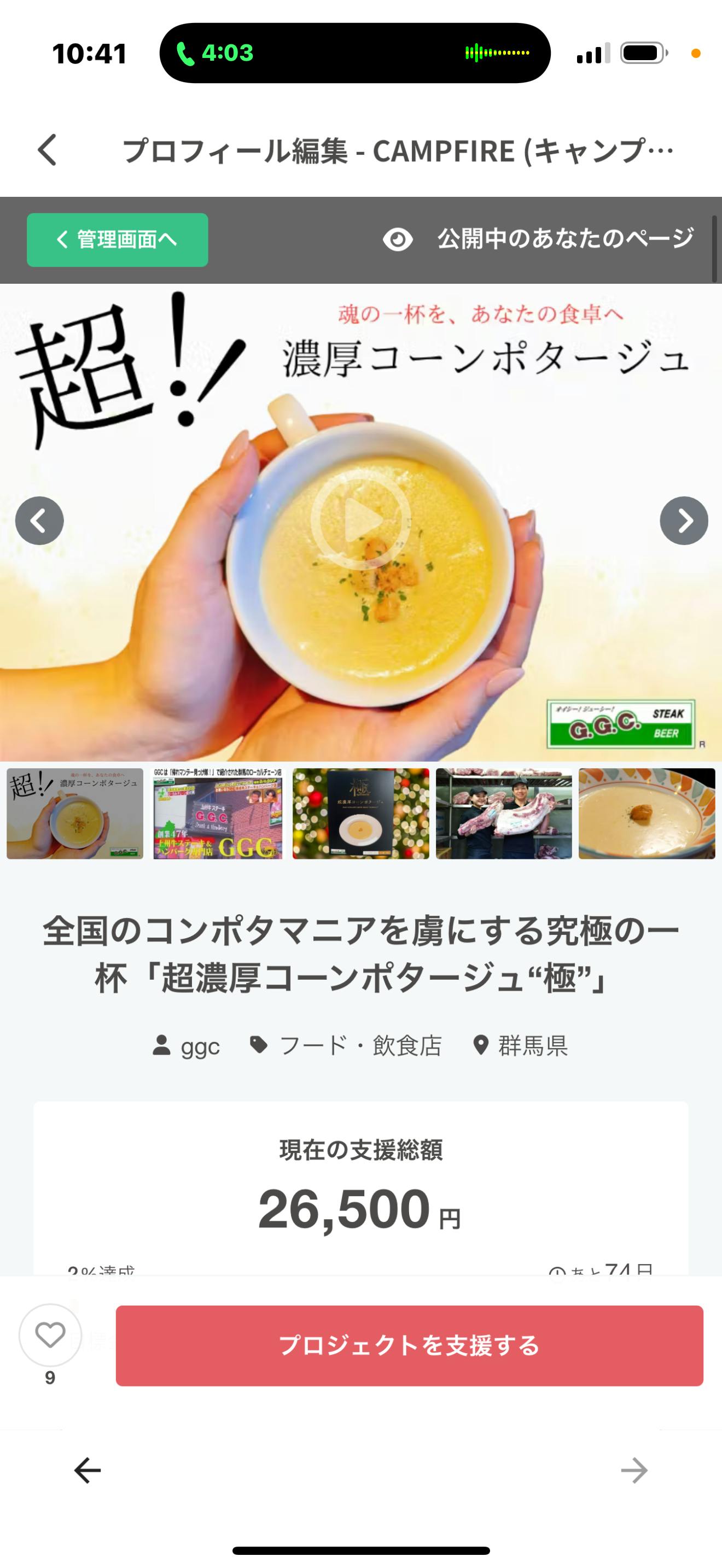 2025/01/16 12:30こんにちは!(株)GGCの福島です。今日も肌寒いですね!クラファンを初めて2日ですが、早速4人の方にご支援を頂きました、、、!本当に、ありがとうございます。まさかこんなに早くご支援頂けるとは思ってもおらず、感謝と驚きでいっぱいです。なぜ、ご支援頂けたか、一人一人の方にお伺いしたい気持ちでいっぱいです、、、!どうぞ今後ともよろしくお願いします。 もっと見る