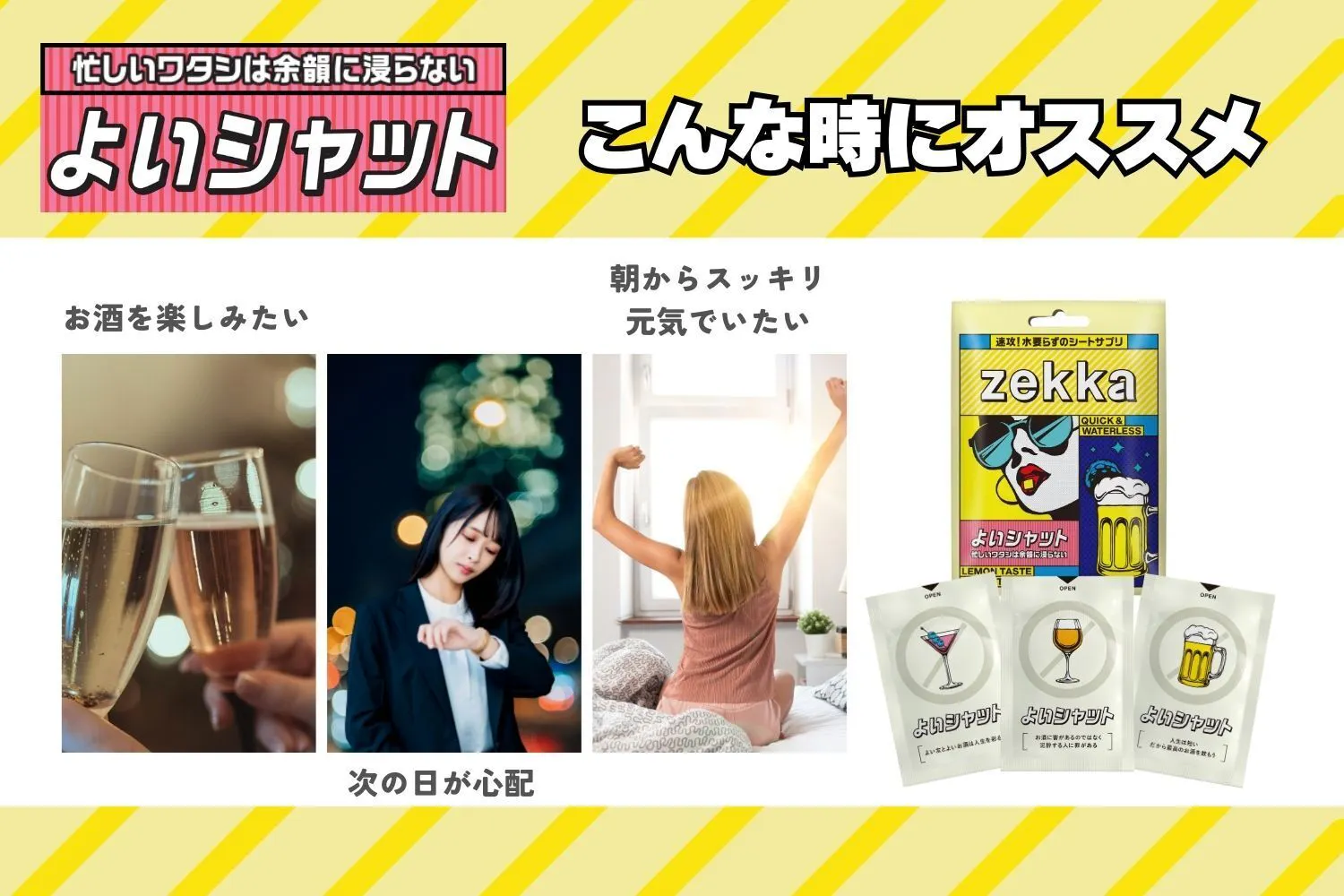 「よいシャット」は、お酒が好きな方々の翌朝の悩みや、不満・不安にアプローチ。