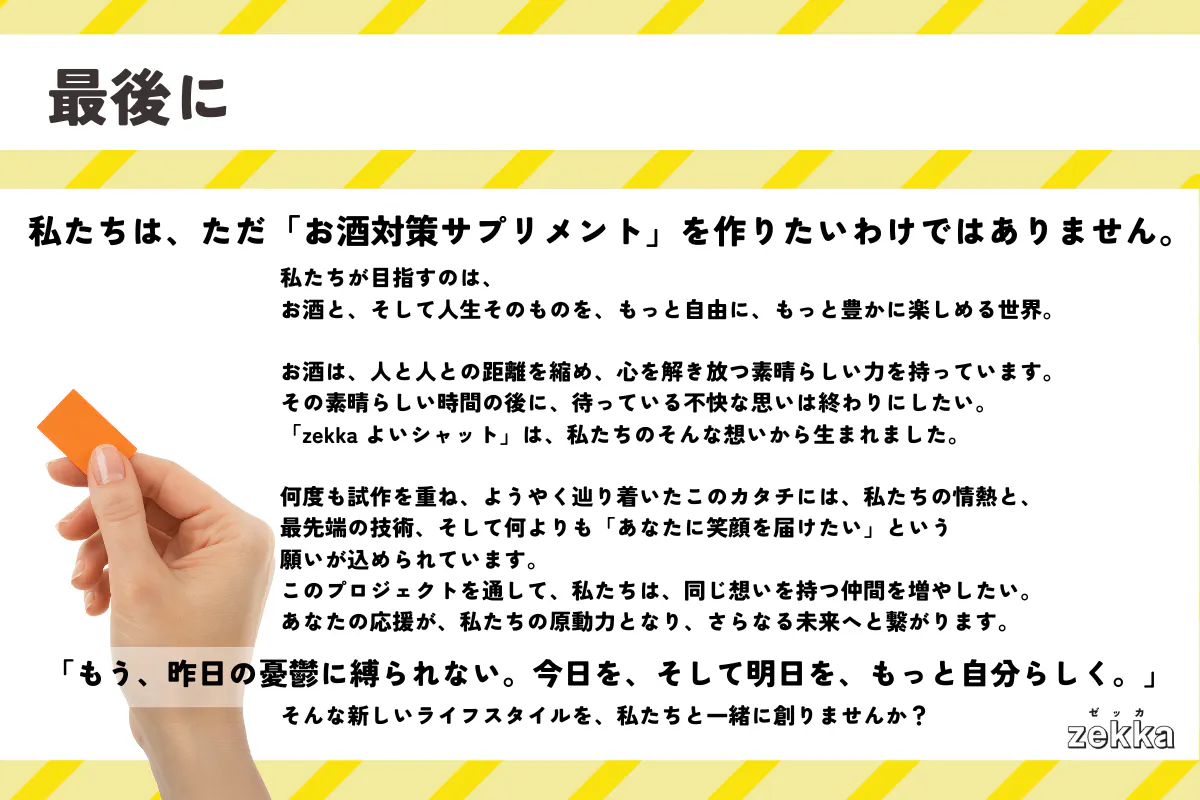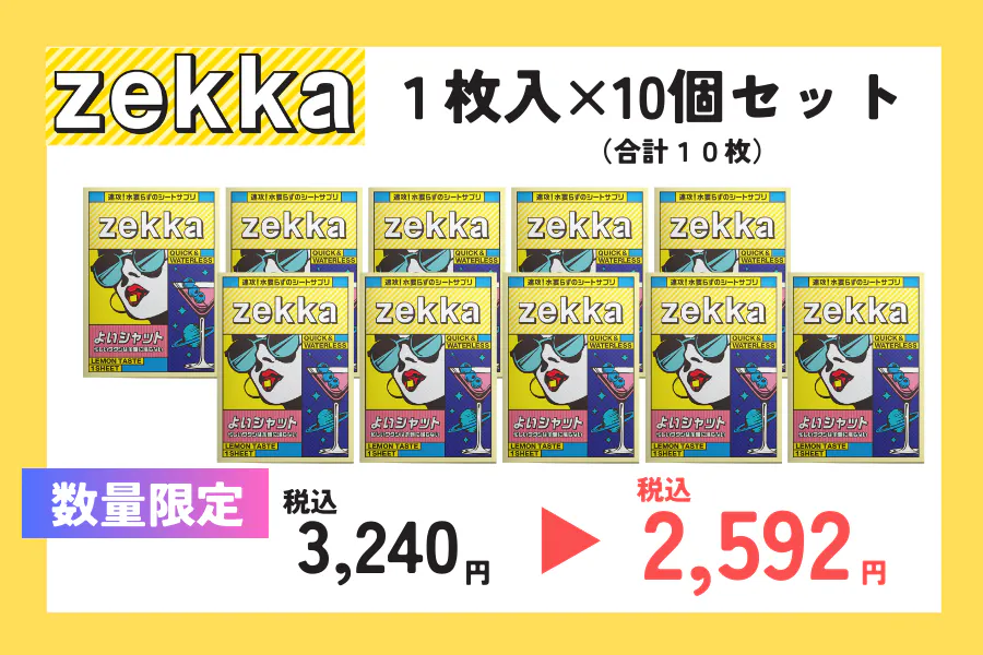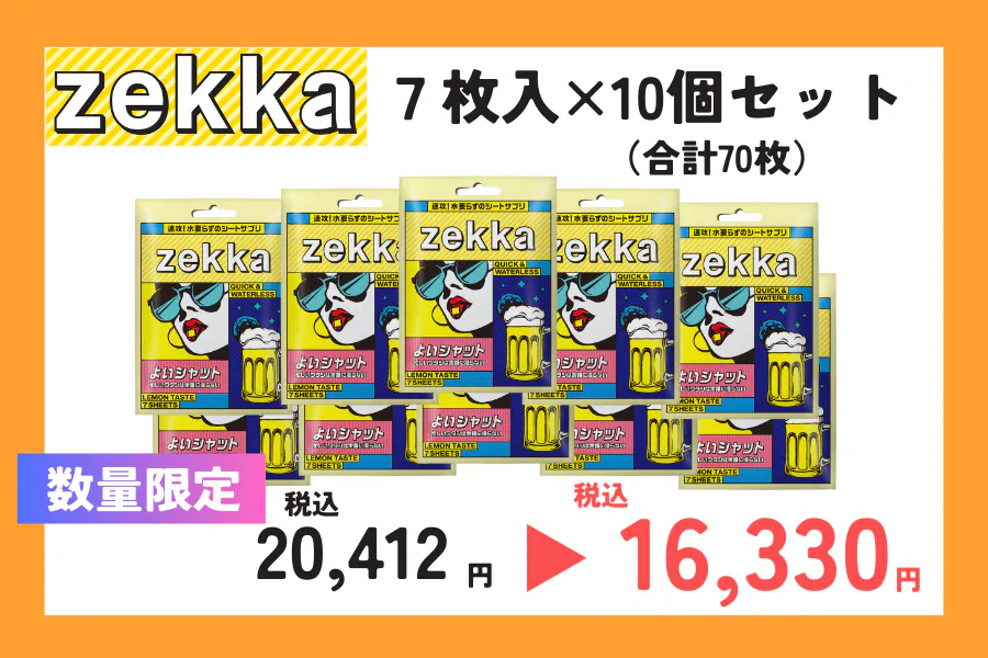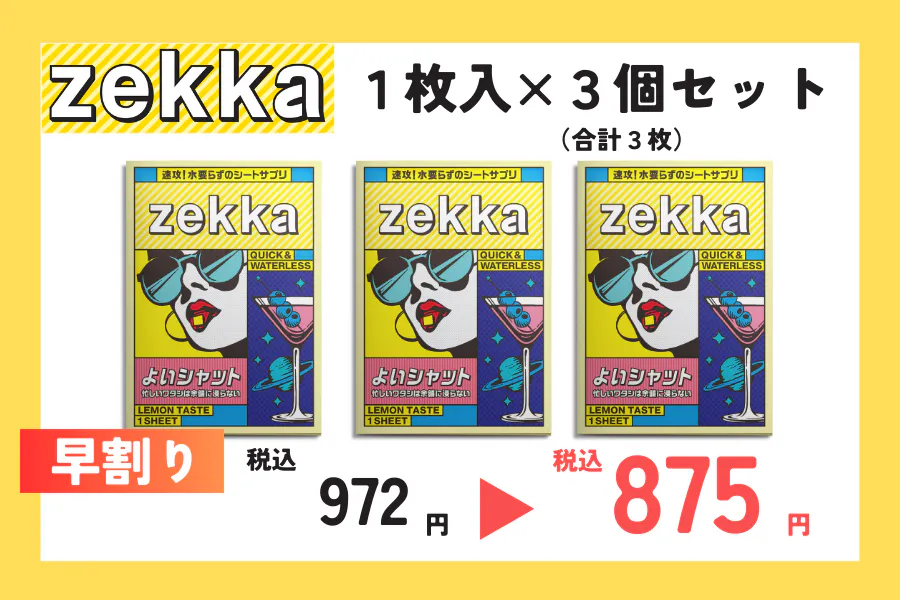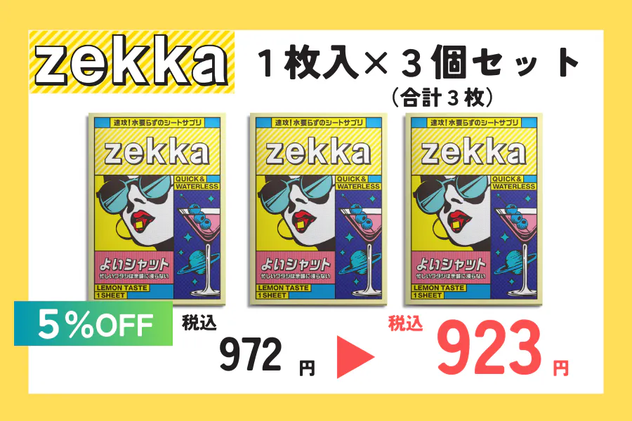私たちは、日々感じる日常の悩みを「今」解決すべく、次世代シート型サプリメント『zekka(ゼッカ)』を開発しました。今、必要な悩みに対して最適なアプローチを行う新たなアイテムとして、「飲む」から「溶ける」サプリメントへ。是非、違いを体感してください。