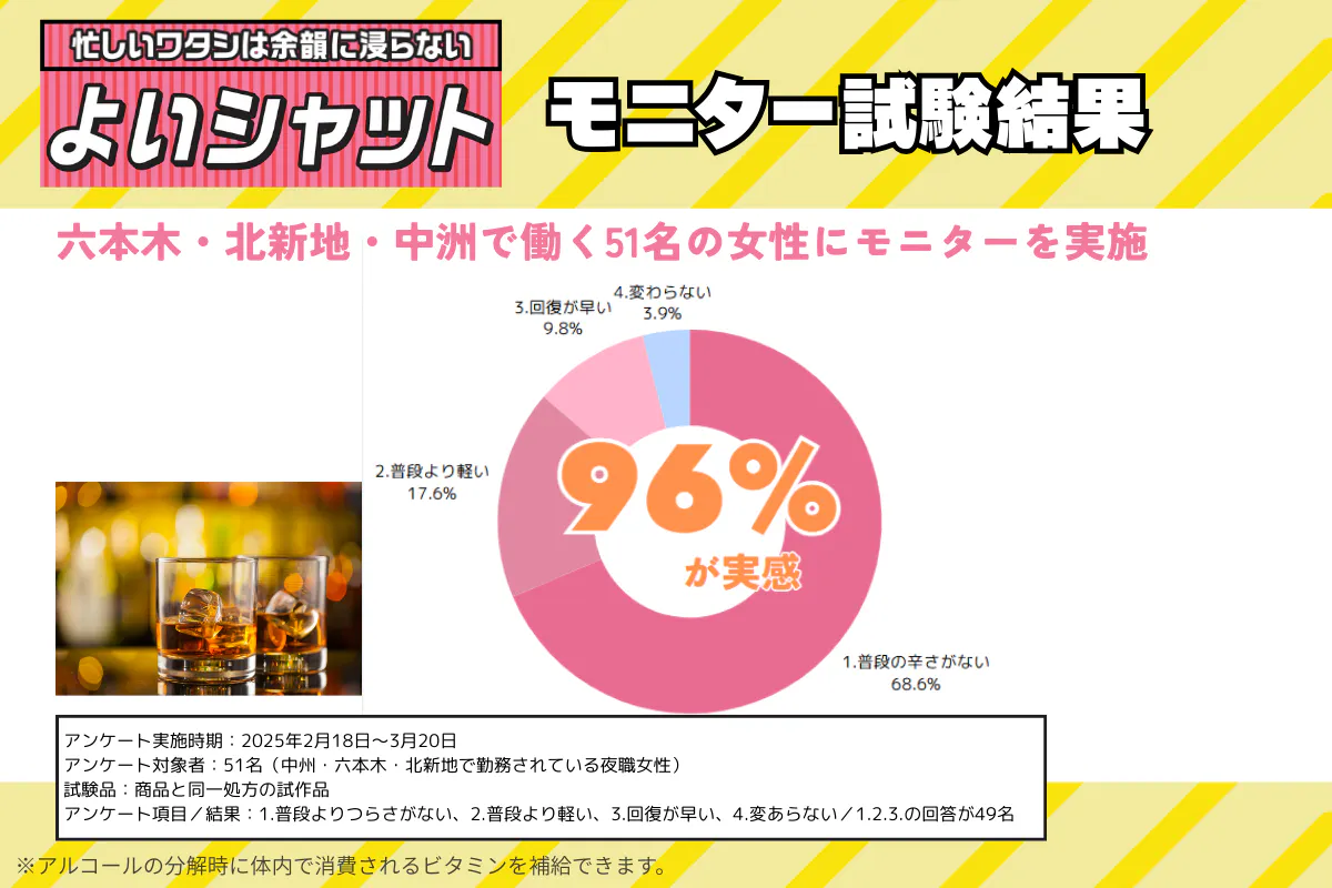 お酒を飲むことが欠かせない、中洲、六本木、北新地などで働かれている女性にモニターを実施。
