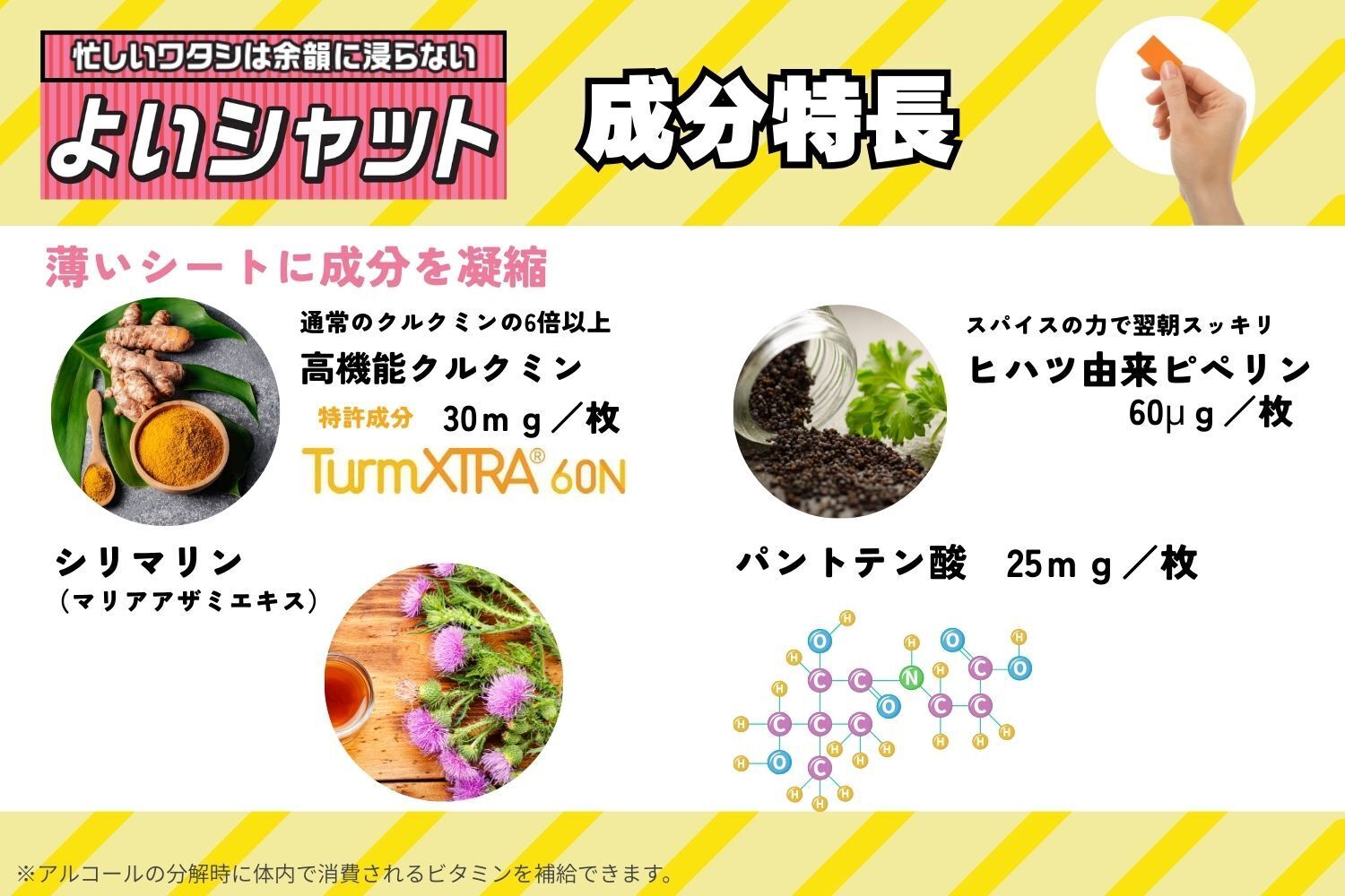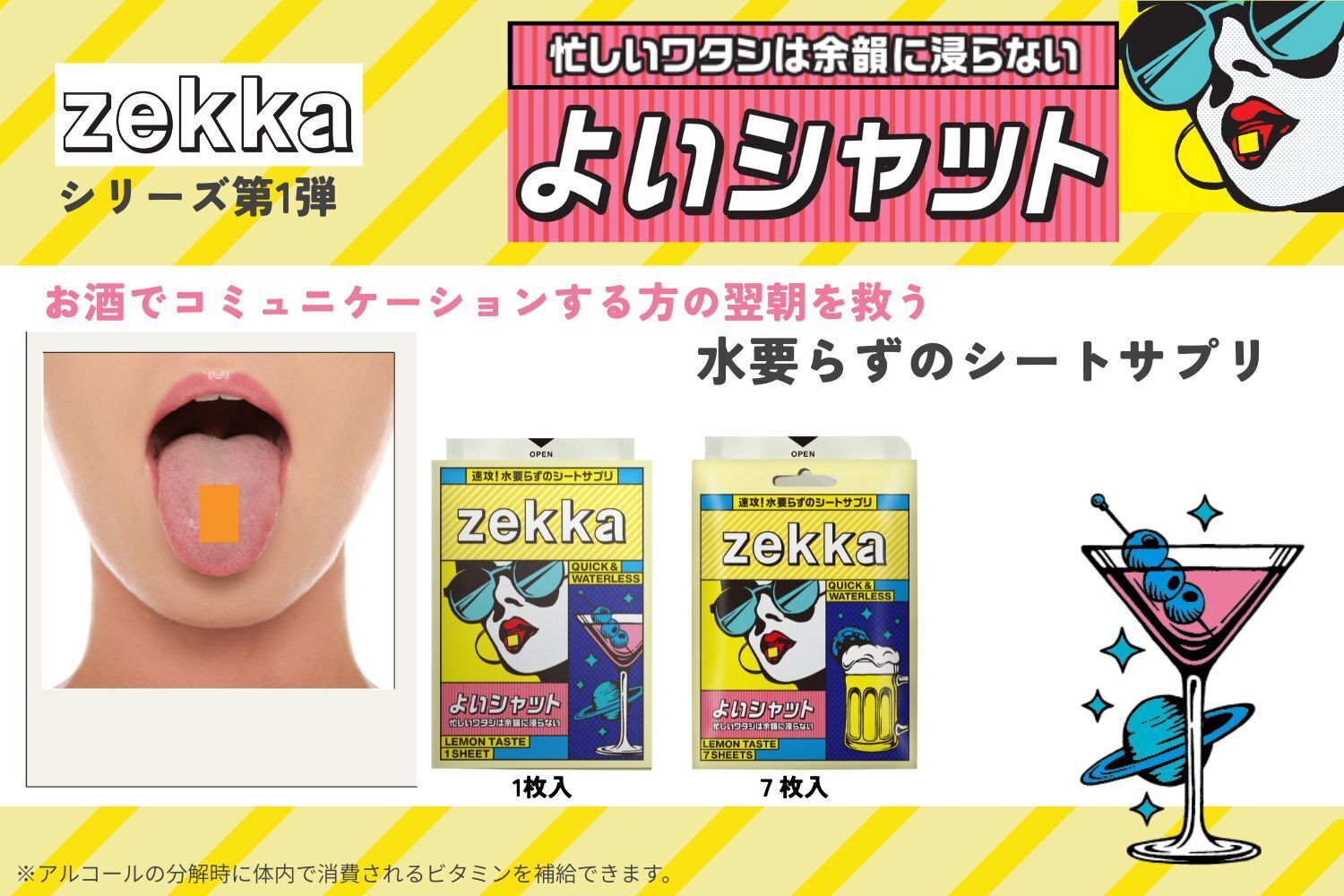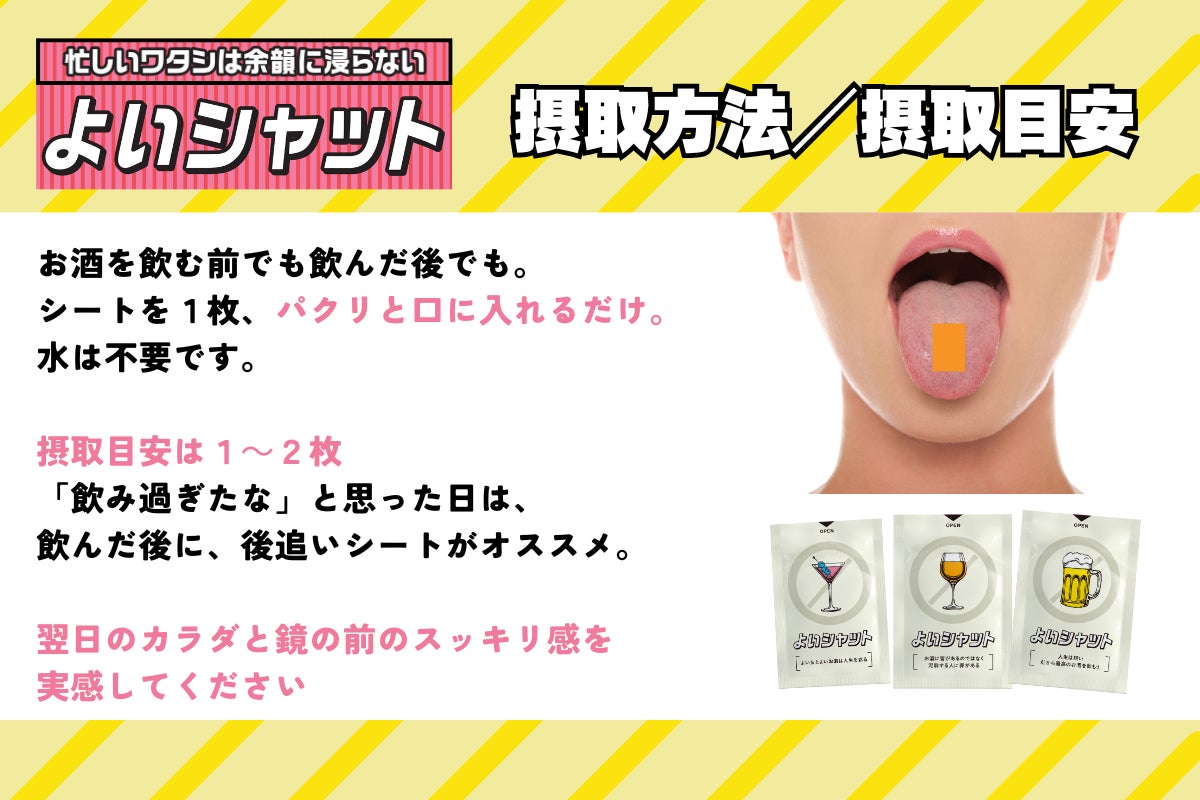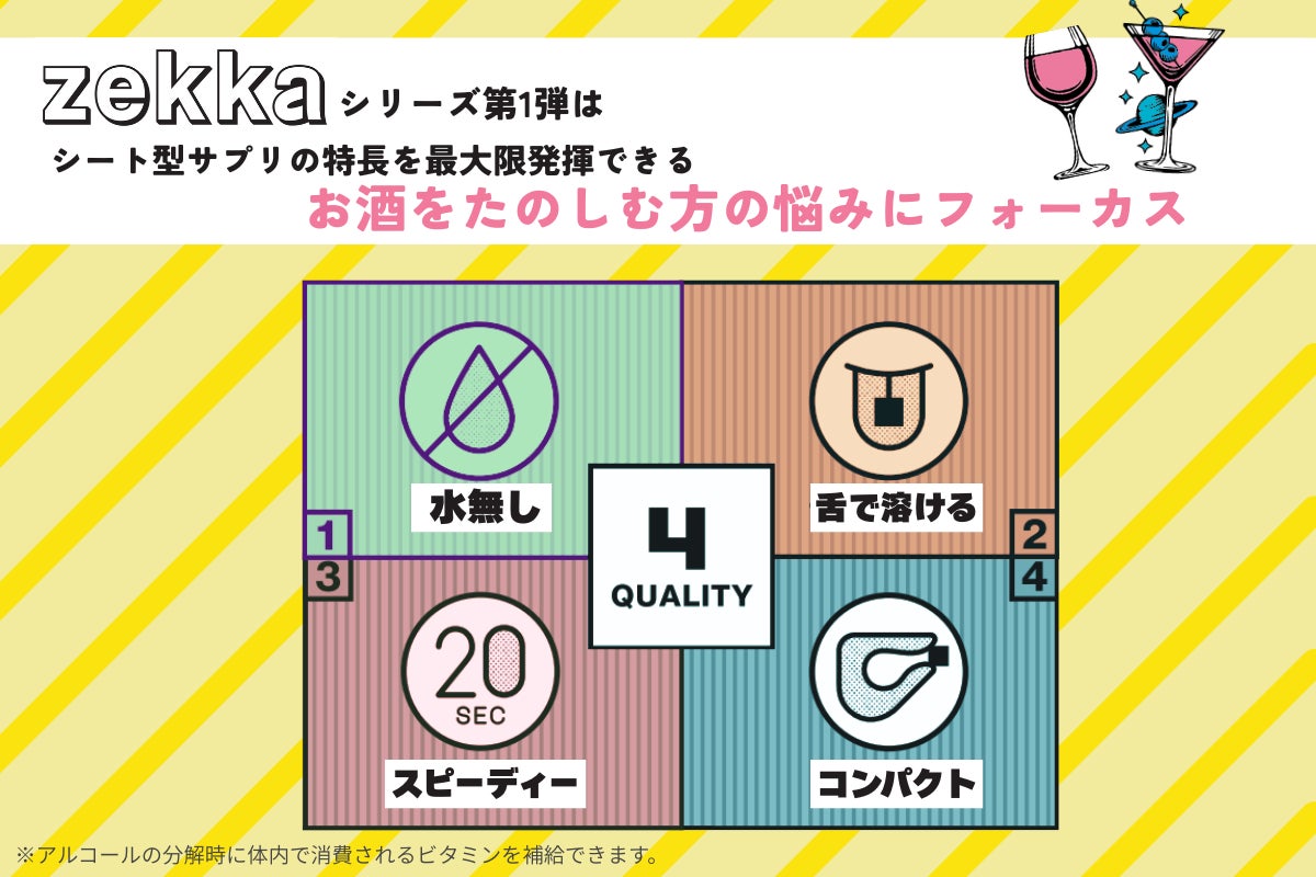 お酒を飲む前に水分を飲みたくない、いつでもどこでも時間も場所も選ばず摂取可能(水不要)、薄いからポーチや財布に忍ばせられる(携帯性)、サッと溶ける(速攻性・体感性)。「飲みの場面」で活躍する新しいアイテムです