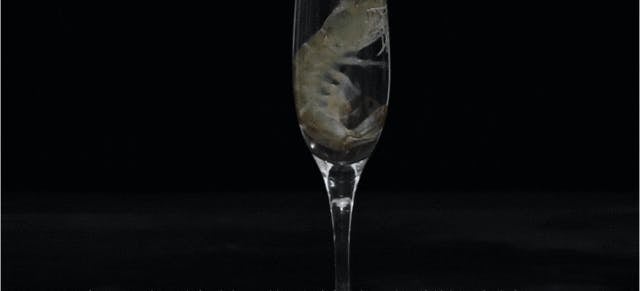 ドライアイスとエビの間に2mmのエアロゲルシートを挟み1分後の経過を観察する実験を行いました。※断熱性実験はSUPIELD・S.KISTLER試験室で行われたものです。