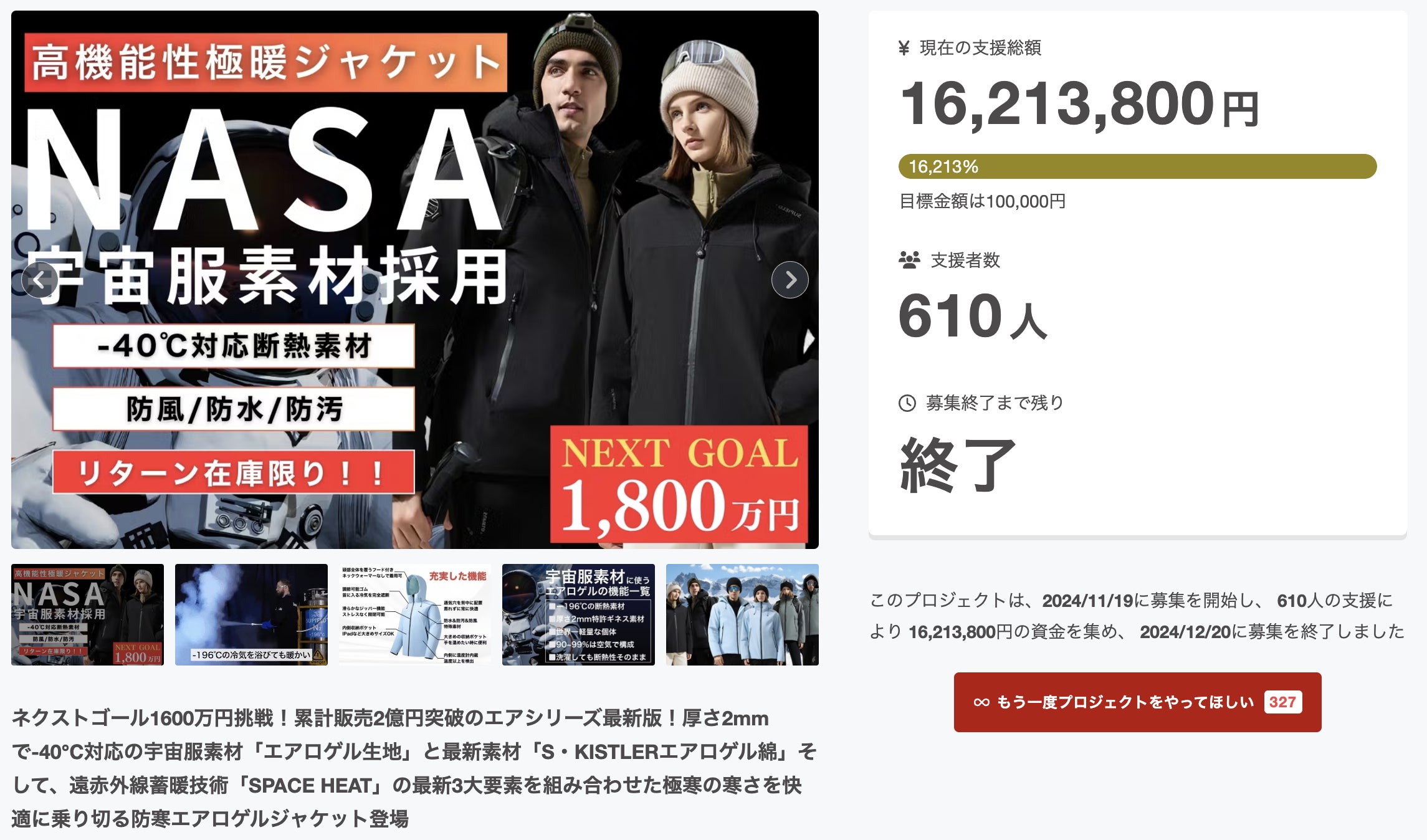 12月20日に終了しました【WARM JACKET V1】を支援いただきました支援者の皆様本当にありがとうございました!おかげ様で1600万円を超える支援いただく事ができました。