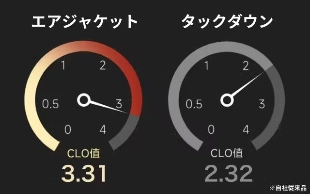 自社従来品のタックダウンに比べてエアジャケットのCLo値は3.31と格段にアップしております!暖かいジャケットは、人体から発熱する体温をいかに外気に放出しないかで、暖かさの性能が決まります。それを表す数値がCLo値です。
