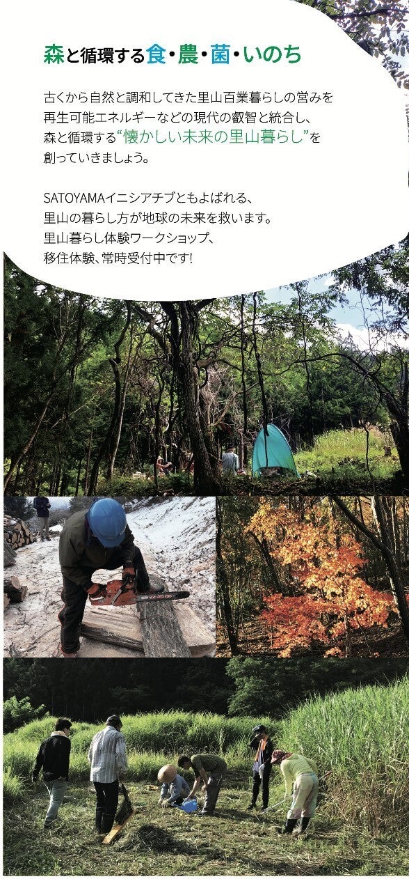 私たちは、アグロフォレストリーという「森を創る農業」を取り入れ、循環型社会を目指した商品開発や地域活性化に取り組んでいます。里山を活用した持続可能な暮らしを提案し、環境保護や地域の伝統文化を再発見して未来へとつなげることを使命としています