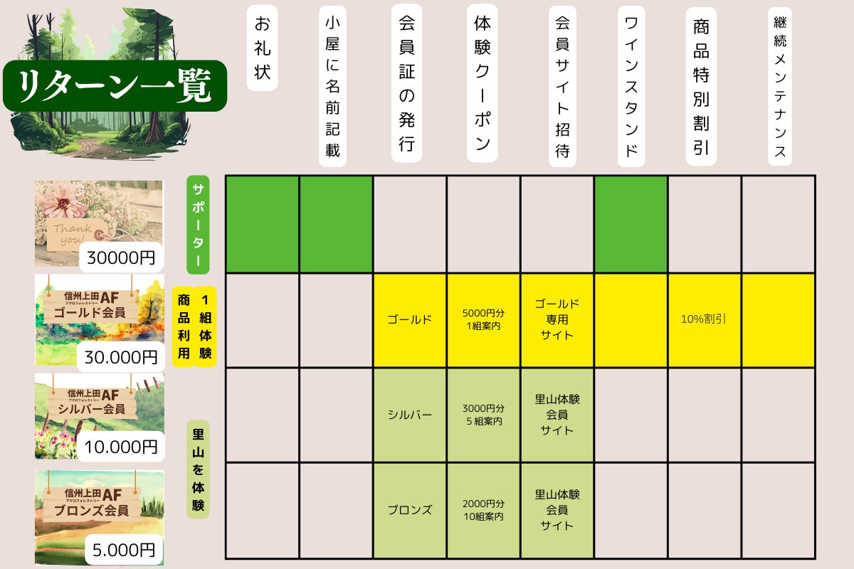 会員特典として、里山体験クーポンや限定グッズ、特別割引をご提供します。