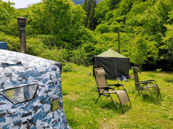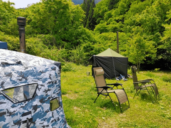 ・里山体験フィールド(別所温泉駅から徒歩20分、車で5分)まで来ていただき、里山林の薪をつかってテントサウナを体験していただきます。ヨモギを浸した温泉水でロウリュウ体験、スチームサウナ体験、マコモ製ヴィヒタでウィスキングをしたあとで、インフィニティ・チェアでととのい体験をしていただけます。マコモ製ヴィヒタはお持ち帰りできます。