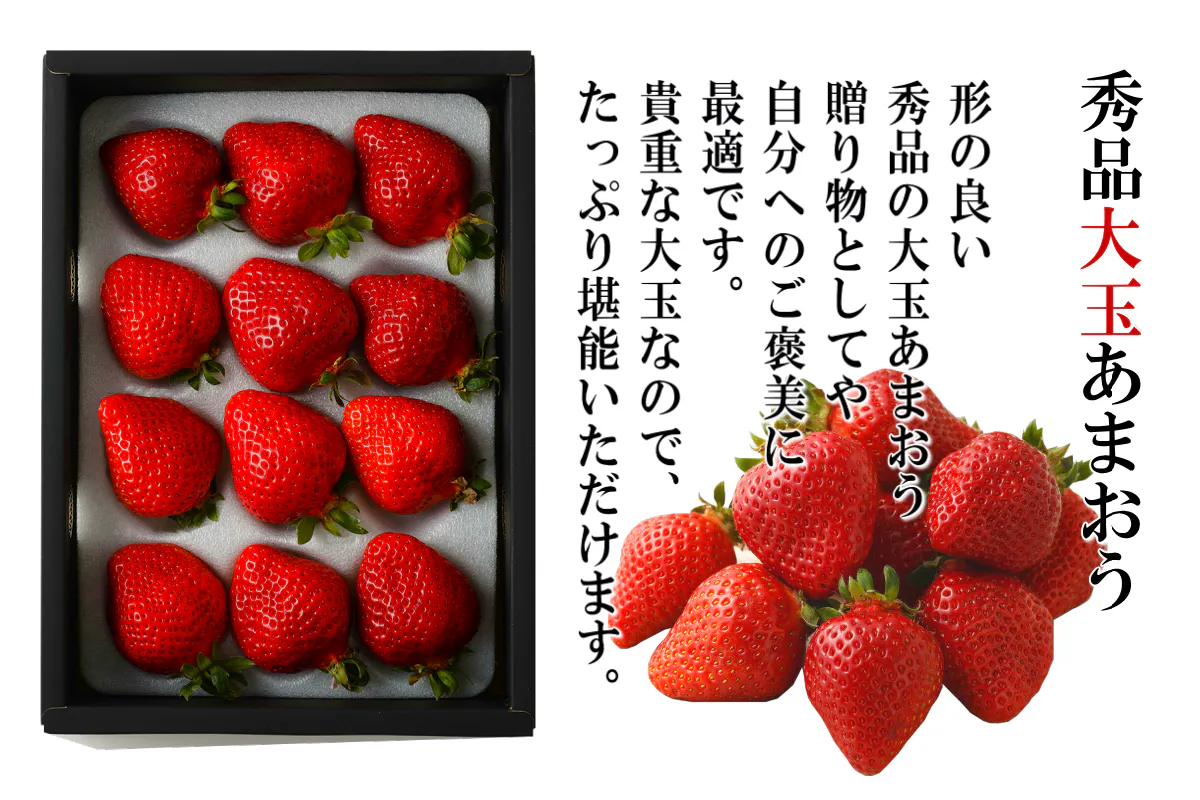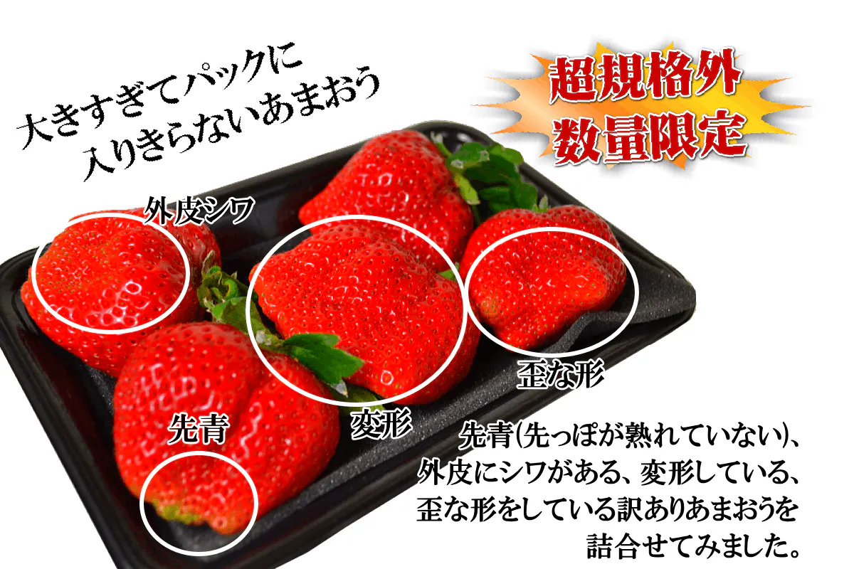 少し形が悪いだけの規格外!味はそのまま、たっぷり満足のあまおうを食べていただきたい♪