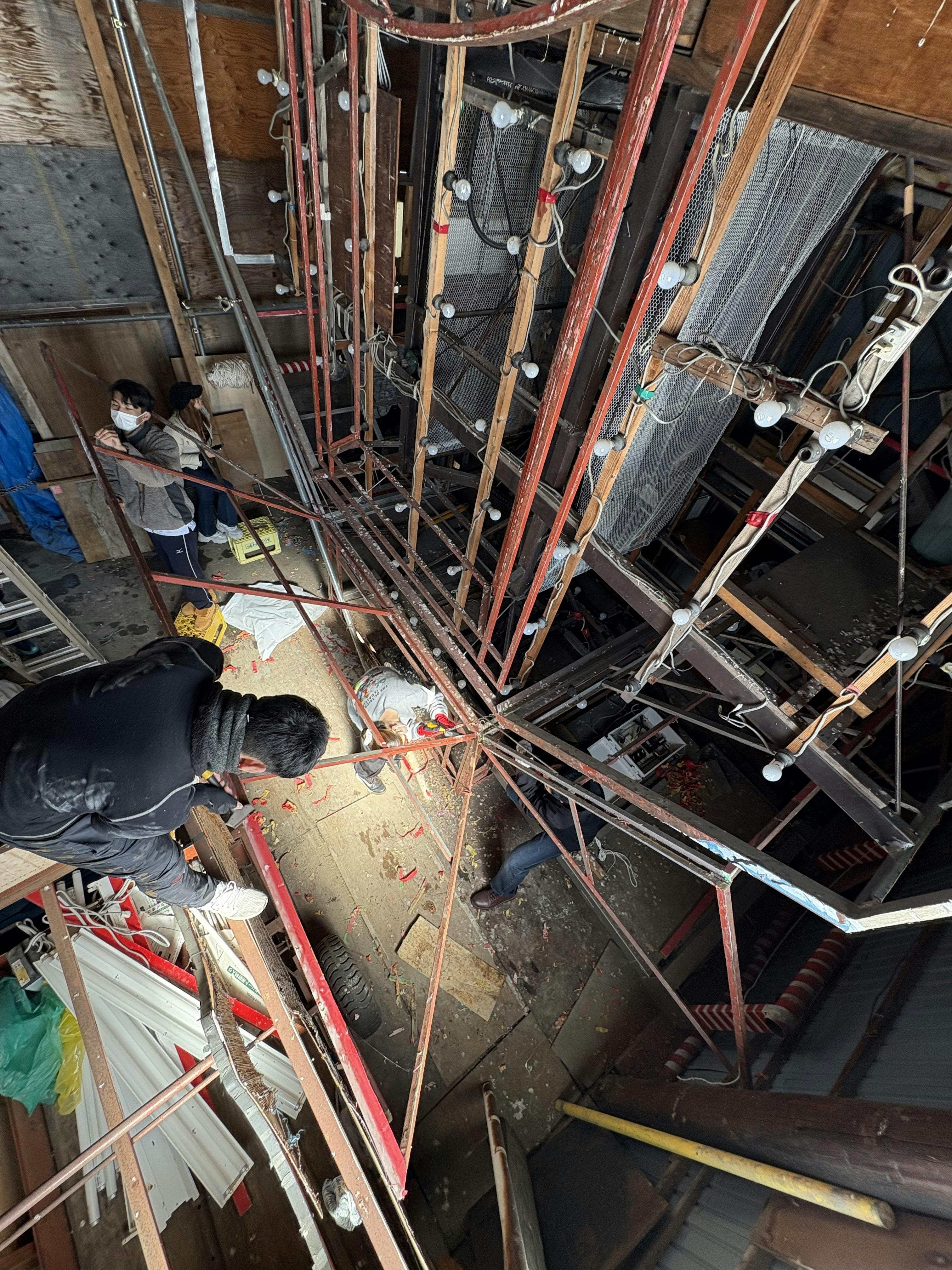 8月まで時間がないので、豪雪に悩まれる中、鉄骨の研磨作業を開始しました!!